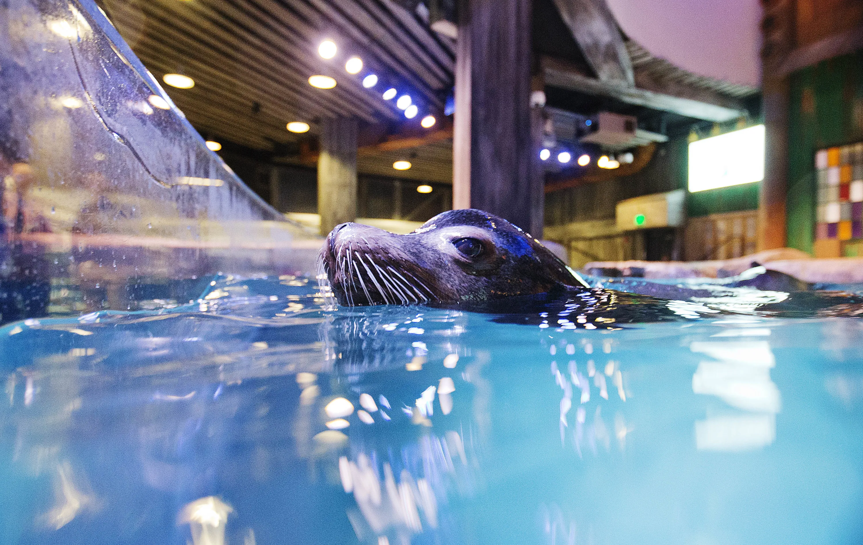 In this Monday, March 28, 2016 photo, Nav, an 11-year-old rescued California sea lion, swims in the water during a training session for a new exhibit at the Georgia Aquarium. (Photo by David Goldman/AP Photo)