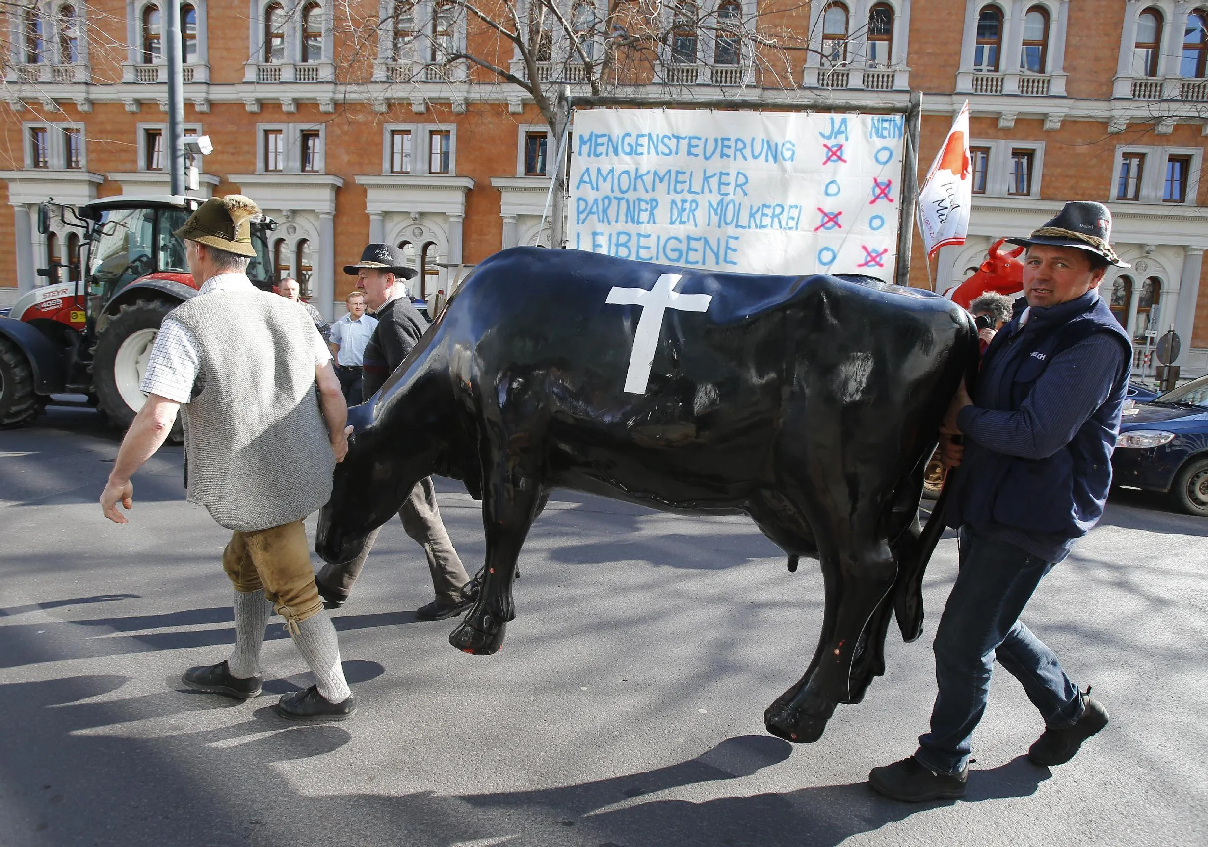 Farmers carry a statue of a cow as they protest against the European Union's milk marketing policy in Vienna, Austria, March 31, 2016. (Photo by Heinz-Peter Bader/Reuters)