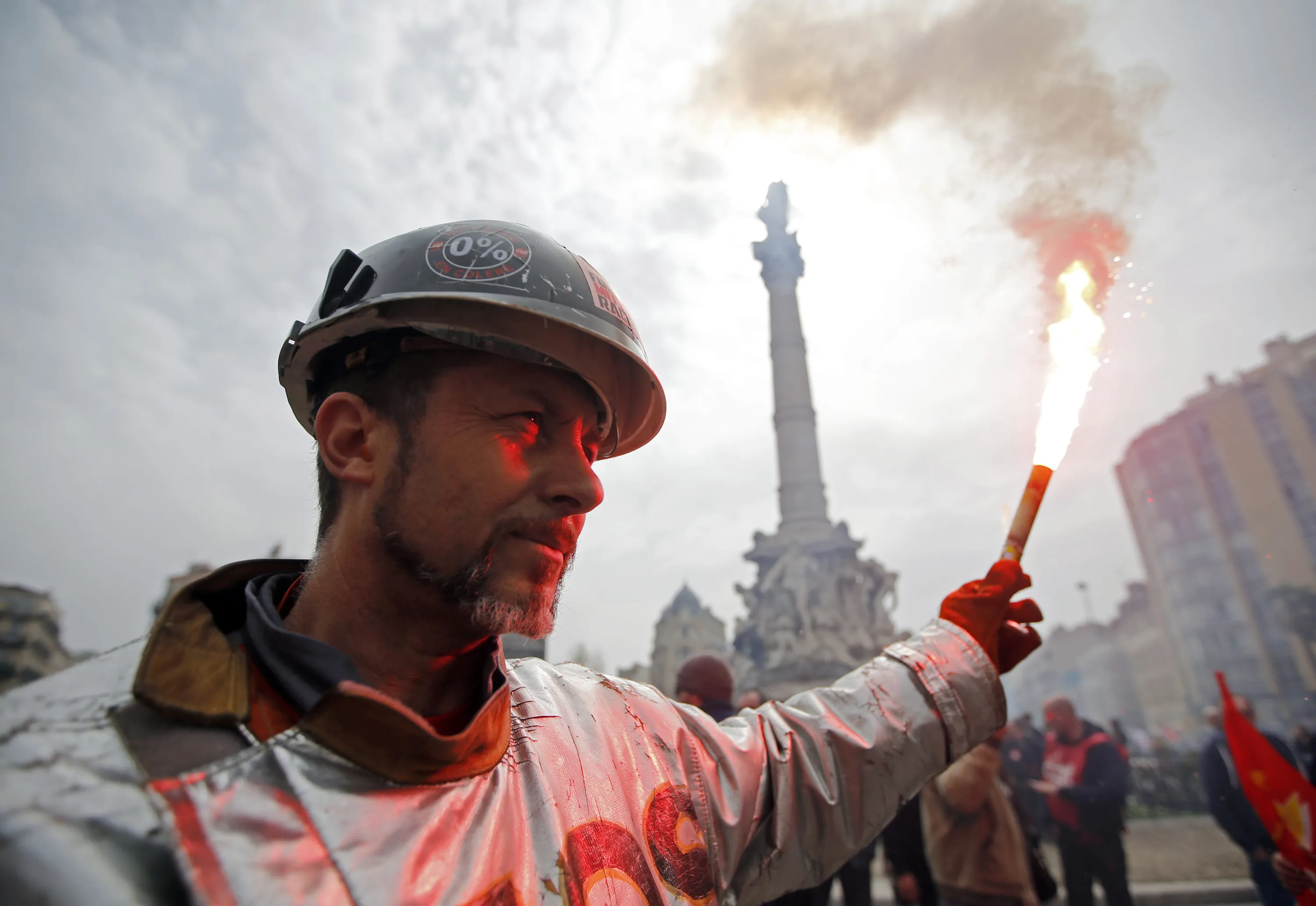 An Arcelor Mittal steel worker dressed in protective work suit demonstrates against the French labour law proposal in Marseille, France, as part of a nationwide labor reform protests and strikes, March 31, 2016. (Photo by Jean-Paul Pelissier/Reuters)