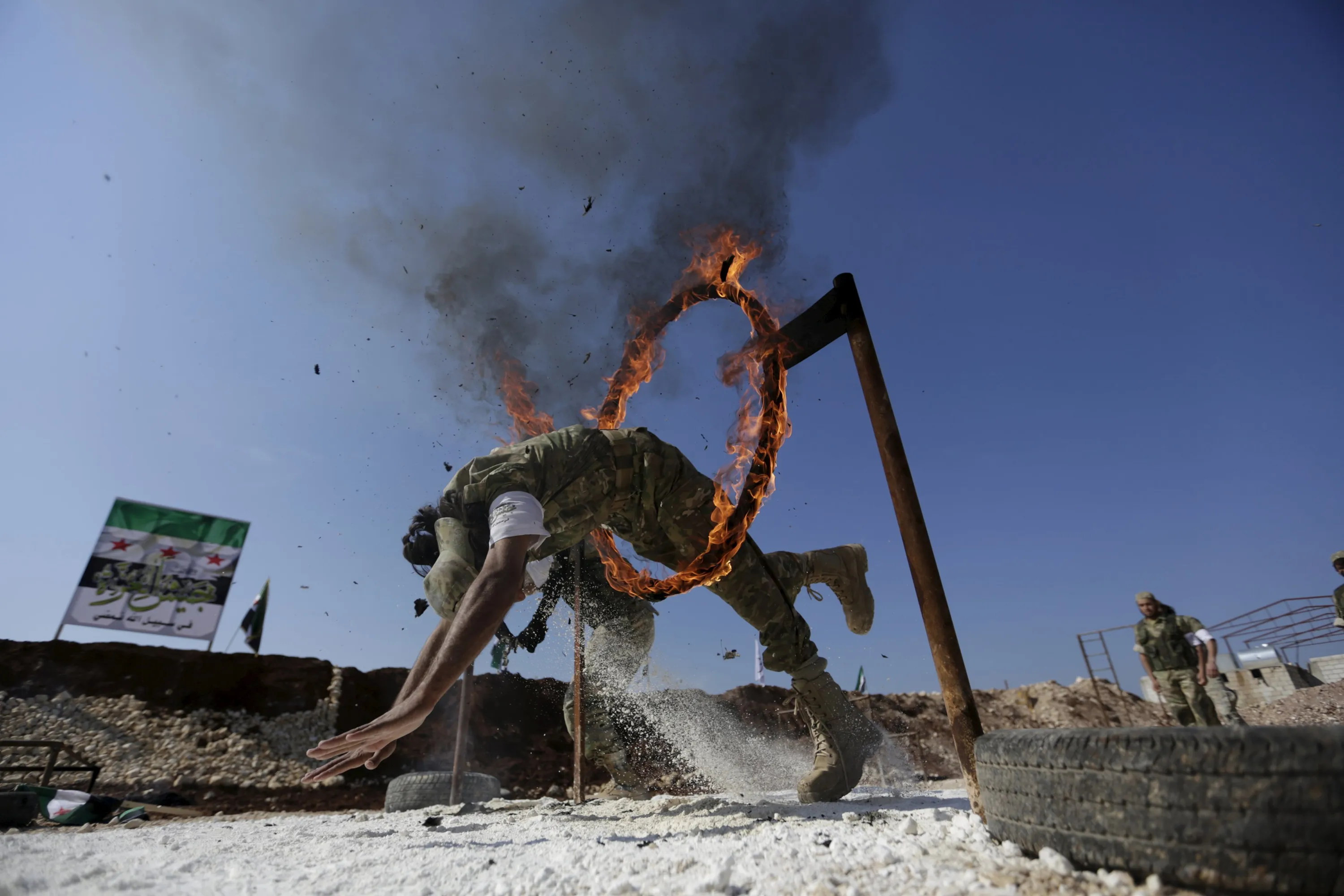 A rebel fighter jumps through a fire loop as he demonstrates his skill during a military display as part of a graduation ceremony at a camp in the north of Hama province, Syria March 31, 2016. (Photo by Khalil Ashawi/Reuters)