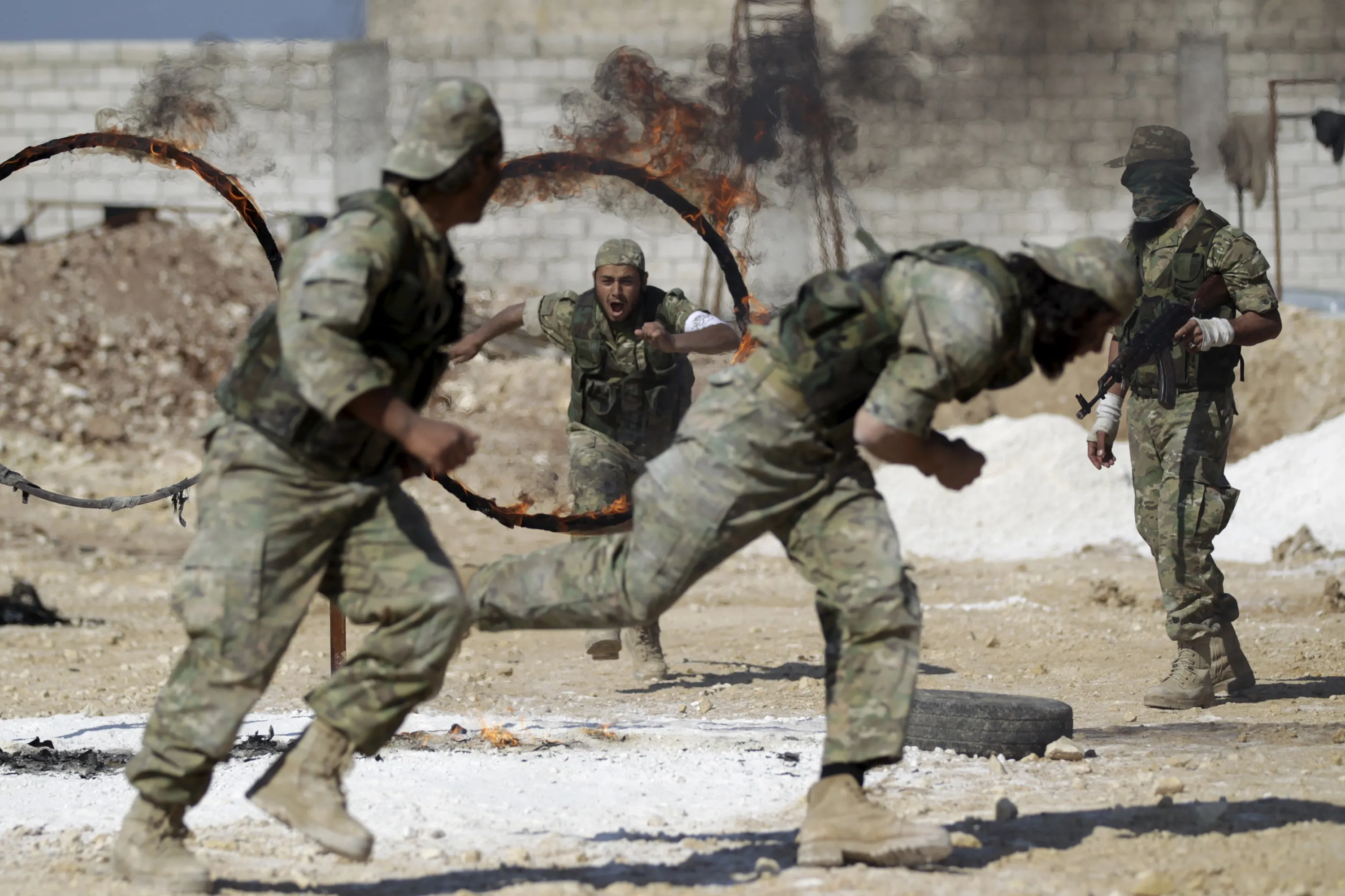 A rebel fighter jumps through a fire loop as he demonstrates his skill during a military display as part of a graduation ceremony at a camp in the north of Hama province, Syria March 31, 2016. (Photo by Khalil Ashawi/Reuters)