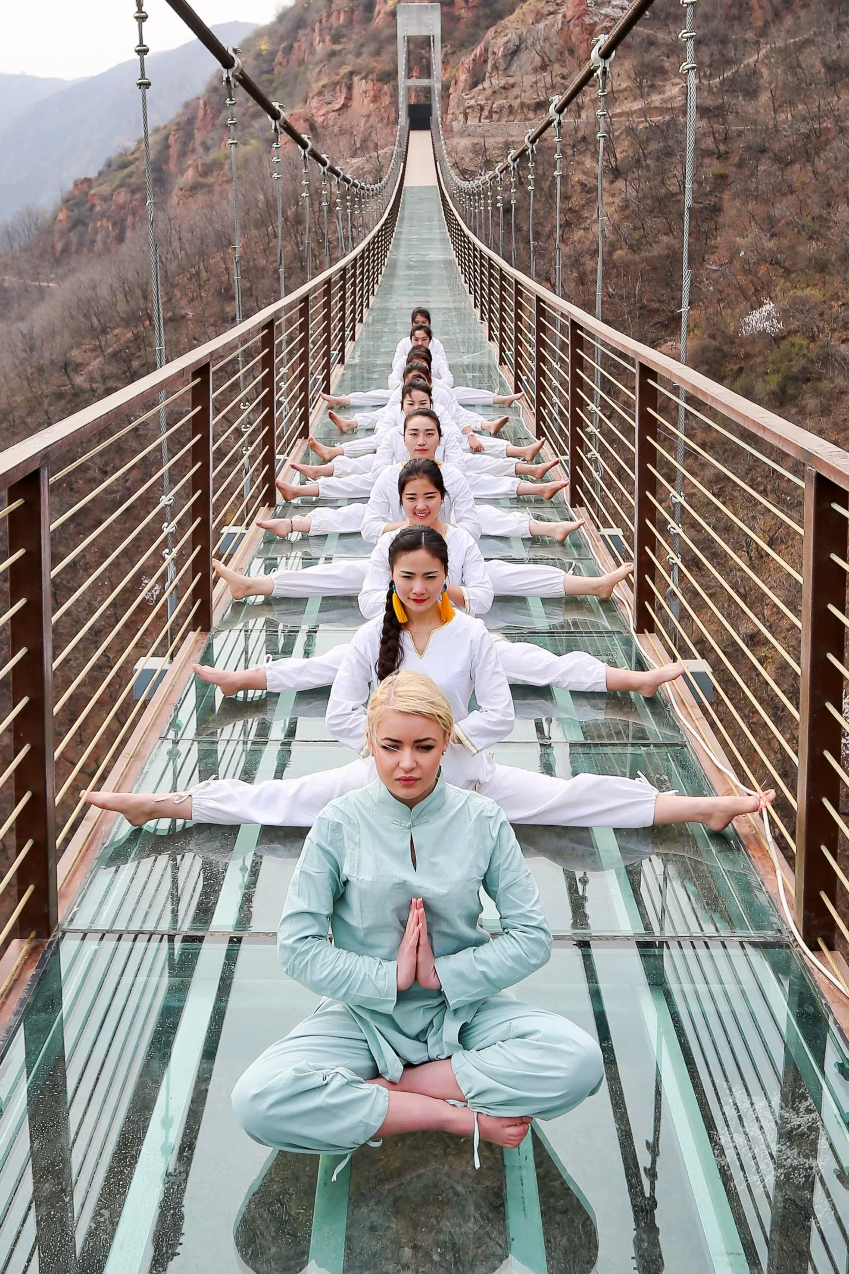Yoga enthusiasts pose on the glass suspension bridge at Fuxishan Tourism Resort, March 30, 2016, in Zhengzhou, China. People did yoga on the glass suspension bridge which was about 100 meter high from the valley bottom in Zhengzhou. (Photo by VCG via Getty Images)