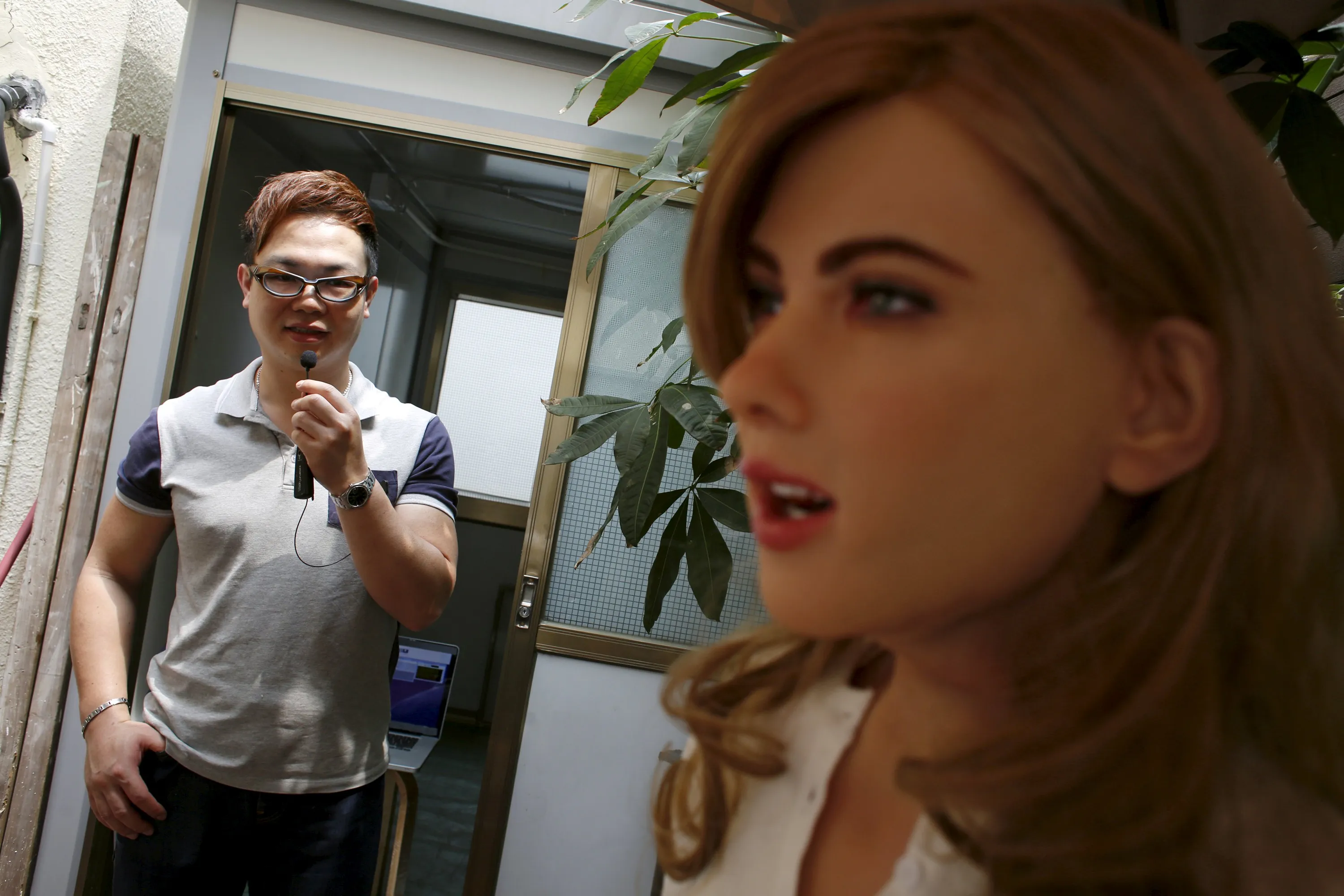 Product and graphic designer Ricky Ma, 42, gives a command to his life-size robot “Mark 1”, modelled after a Hollywood star, in his balcony which serves as his workshop in Hong Kong, China March 31, 2016. (Photo by Bobby Yip/Reuters)