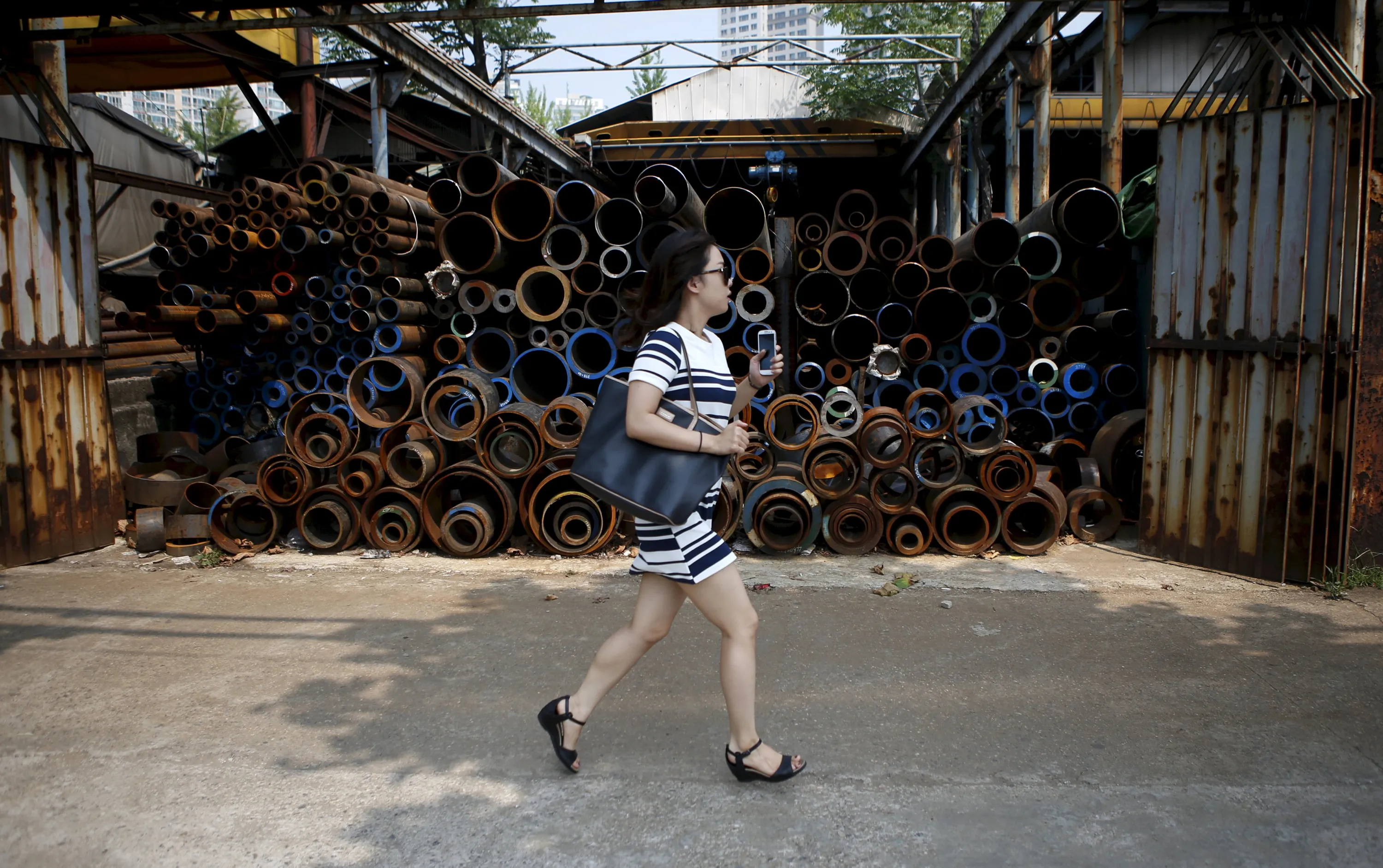 A woman runs past steel products stacked at a steelworks in Seoul, South Korea, in this July 15, 2015 file photo. (Photo by Kim Hong-Ji/Reuters)