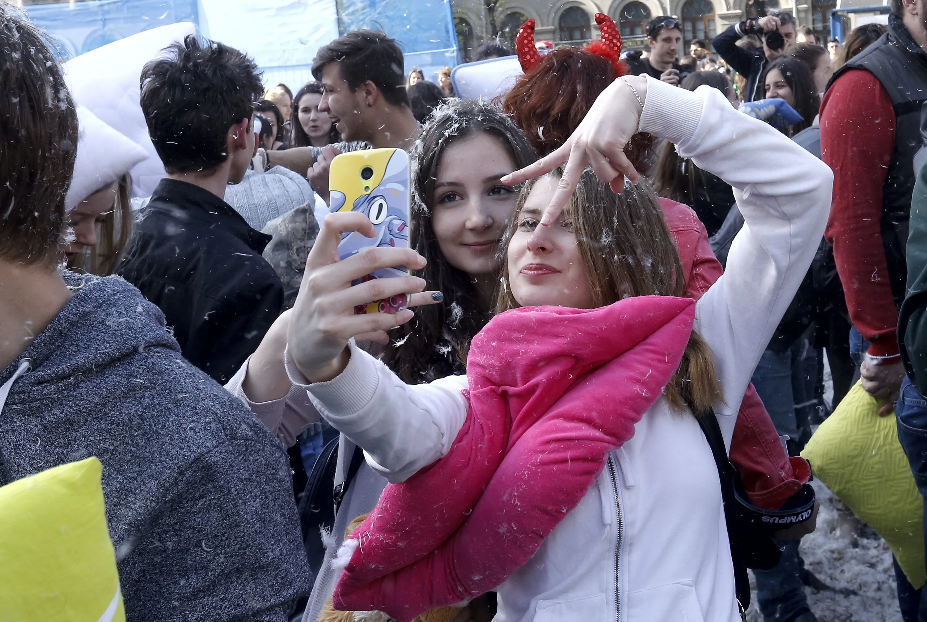 Two Romanian young women make a 'selfie' snapshot after fighting with pillows during the International Pillow Fight Day in Bucharest, Romania, 02 April 2016. (Photo by Robert Ghement/EPA)