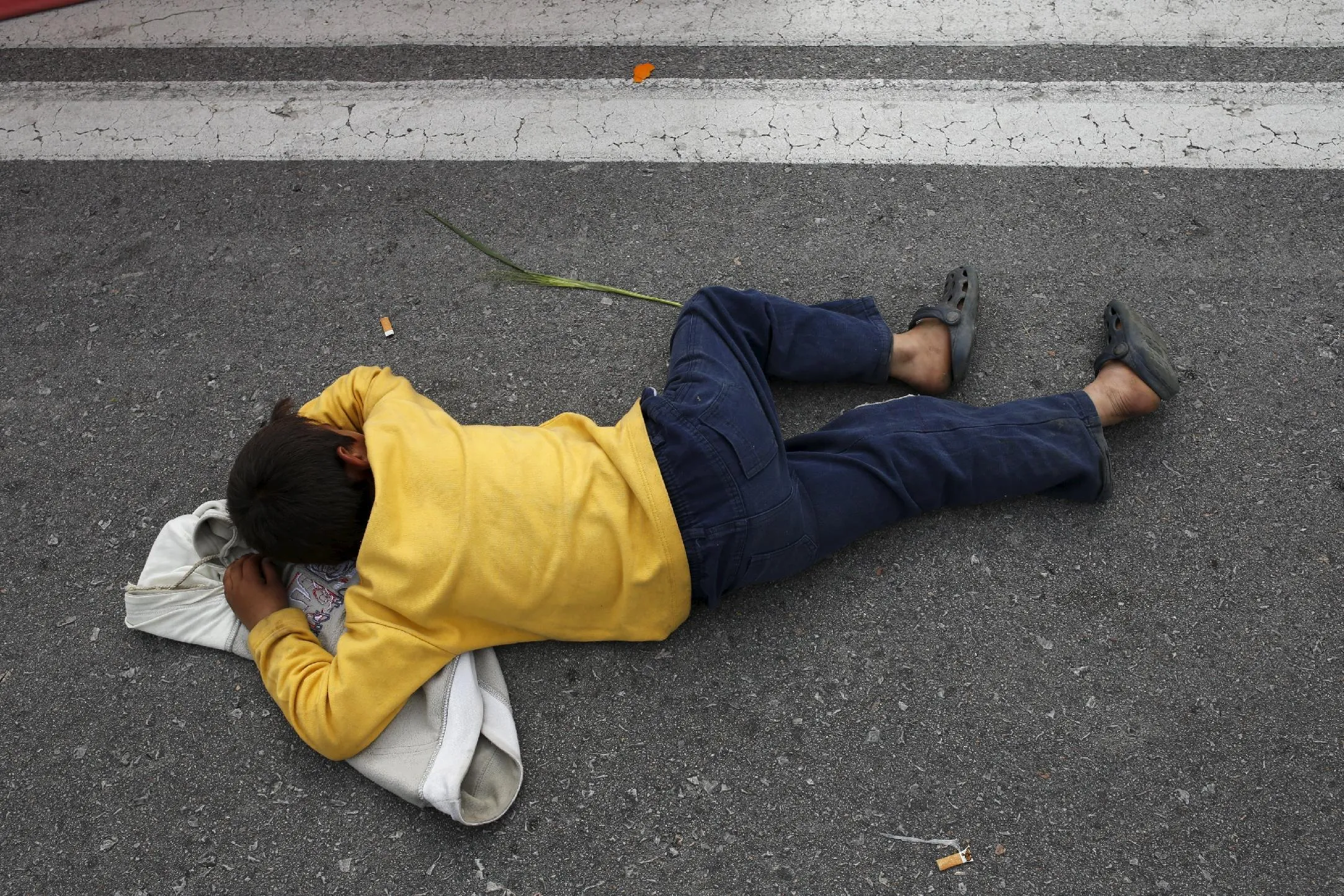 A child sleeps as migrants and refugees block the highway during a protest near the Greek-Macedonian border, near the town of Polykastro, Greece, April 2, 2016. (Photo by Marko Djurica/Reuters)