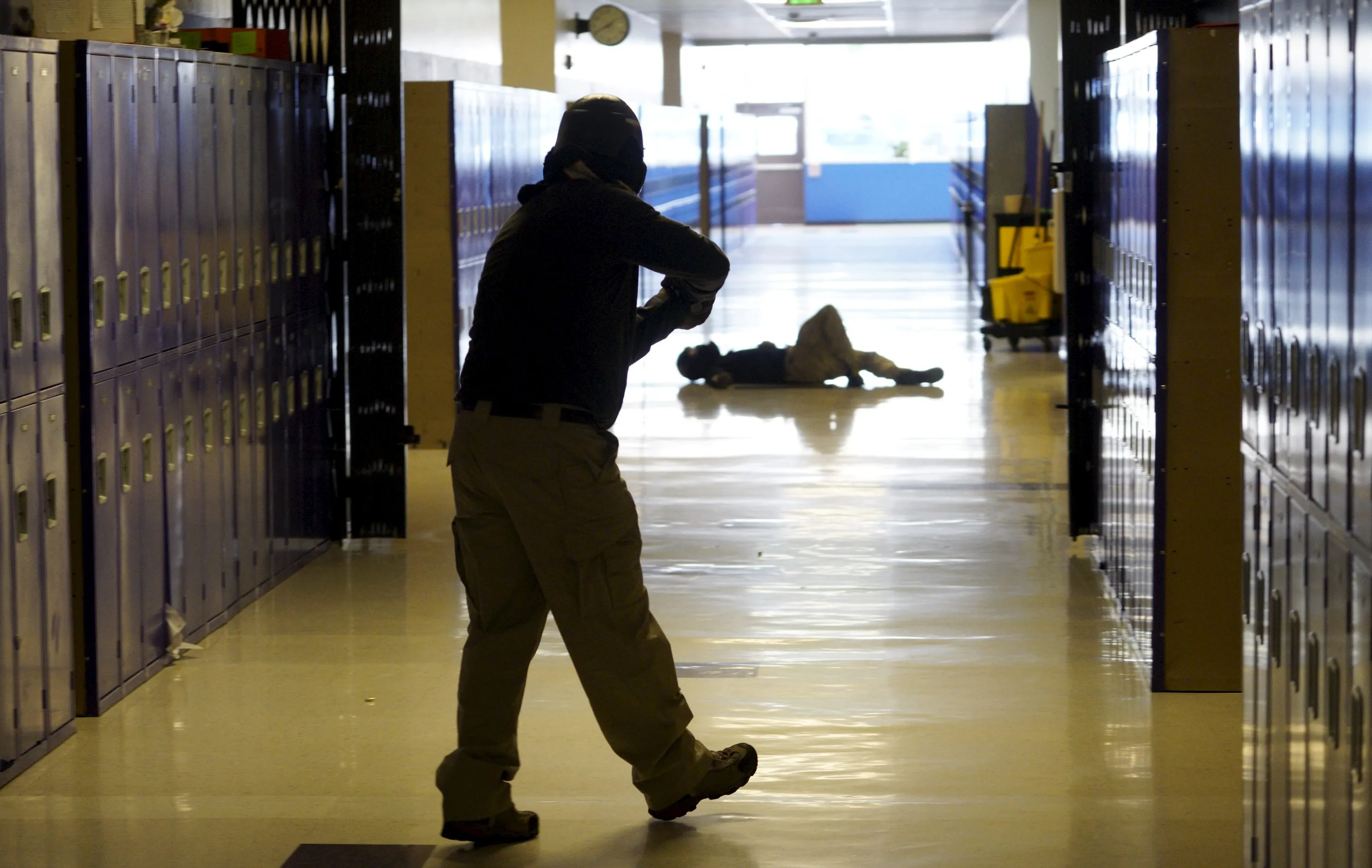 A student searches for a shooter with a mock victim in the background in a middle school during an Active Shooter Response course offered by TAC ONE Consulting in Denver, Colorado April 2, 2016. (Photo by Rick Wilking/Reuters)