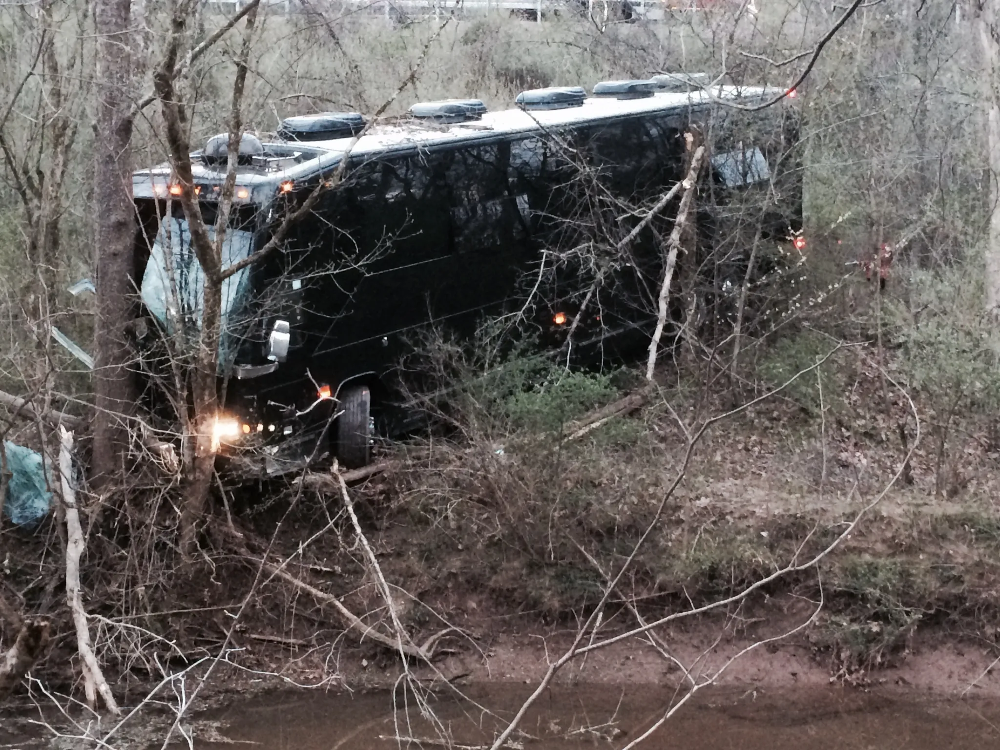 A tour bus for musician Gregg Allman's band rests against a tree near a creek after veering off Interstate 77 Wednesday morning, April 6, 2016, near Goldtown, W.Va. A tour spokesman for Allman's band says three crew members have been injured. The bus was headed to a concert Wednesday at the Clay Center in Charleston, about 20 miles south of Goldtown. Clay Center spokeswoman LeAnn Cain said the concert is still on. Allman wasn't on the bus. (Photo by John Green/WSAZ-TV via AP Photo)