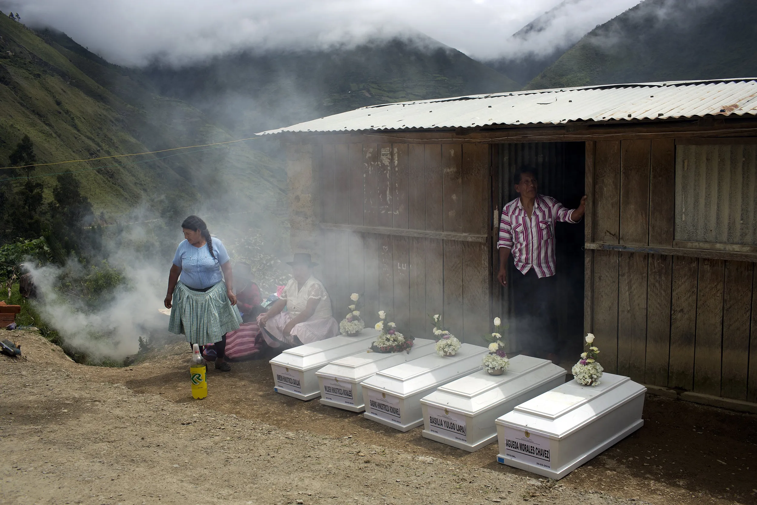 In this March 29, 2016 photo, villagers gather next to coffins holding the remains of their loved ones, who were slain more than two decades ago by Shining Path rebels, before burying them in the cemetery in Ccano, a village in the Huanta area of Ayachcuo department, Peru. In Ccano, many peasants worked with the military to fight the rebels, and the Shining Path stormed a church here in retaliation, killing everyone praying inside in 1991. (Photo by Rodrigo Abd/AP Photo)