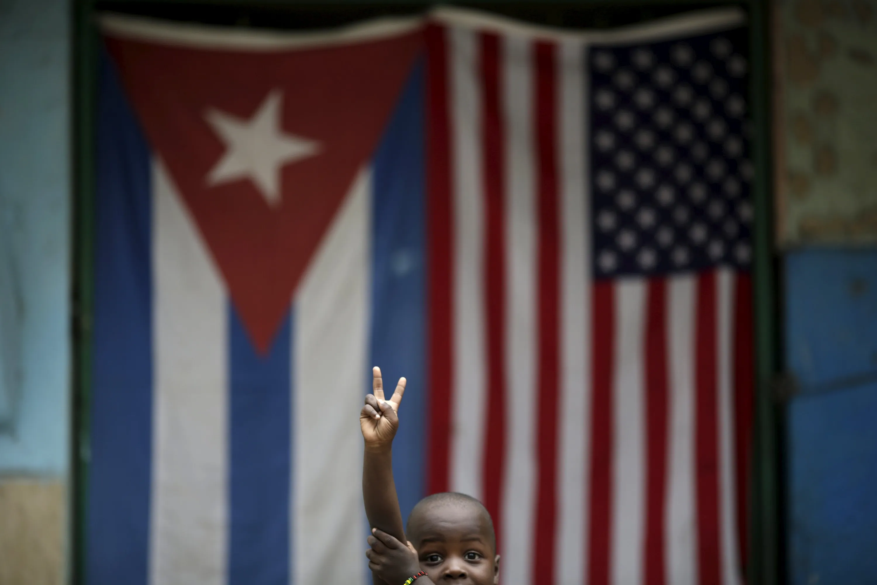 Eric, 3, gestures while posing for a photograph in front of the Cuban and U.S. flags in Havana, March 25, 2016. (Photo by Ueslei Marcelino/Reuters)