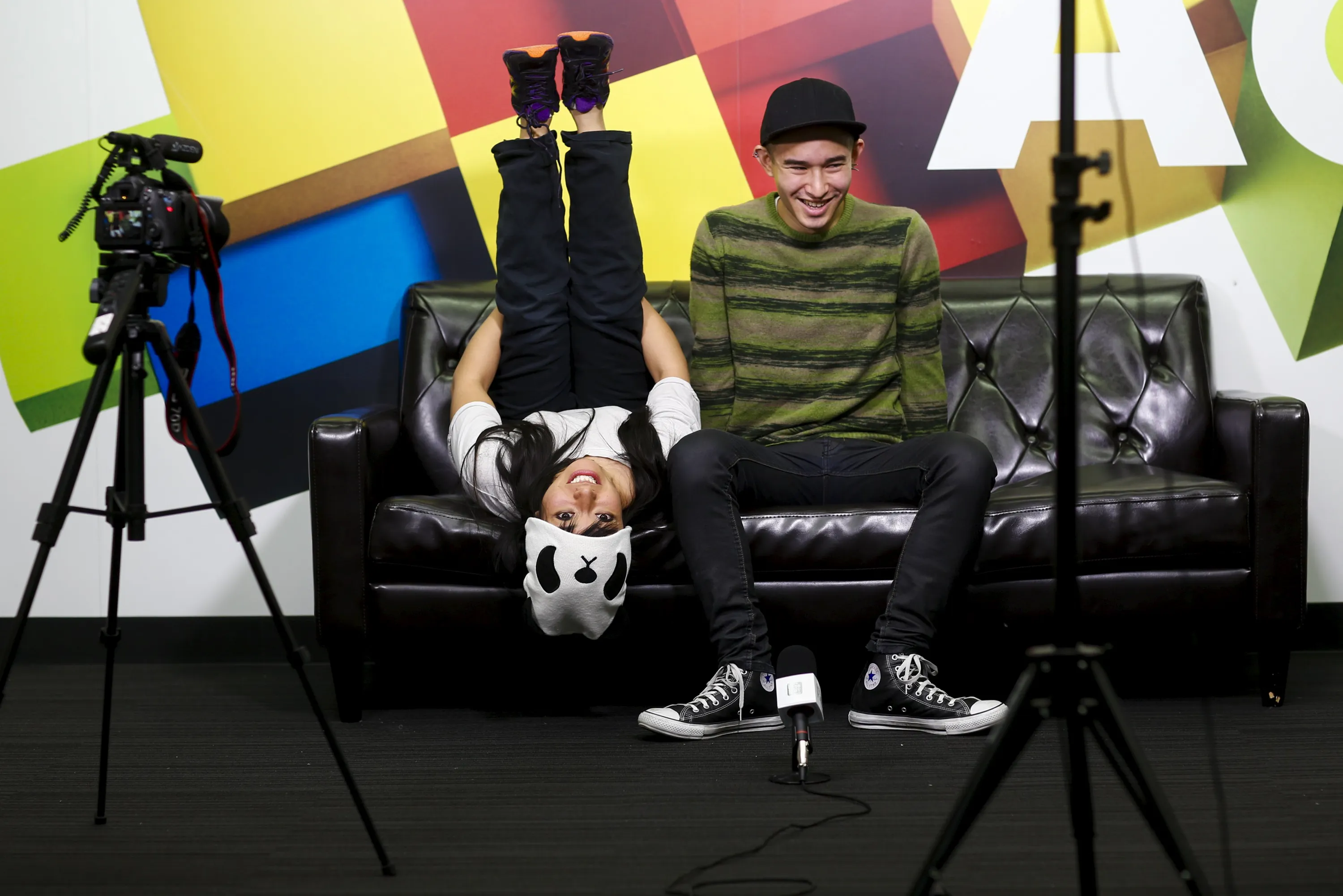 Professional wrestler Kris Wolf (L) and co-guest Thomas Belfer talk about life in Japan as they record a video for the Huffington Post at its office in Tokyo, Japan, March 12, 2016. (Photo by Thomas Peter/Reuters)