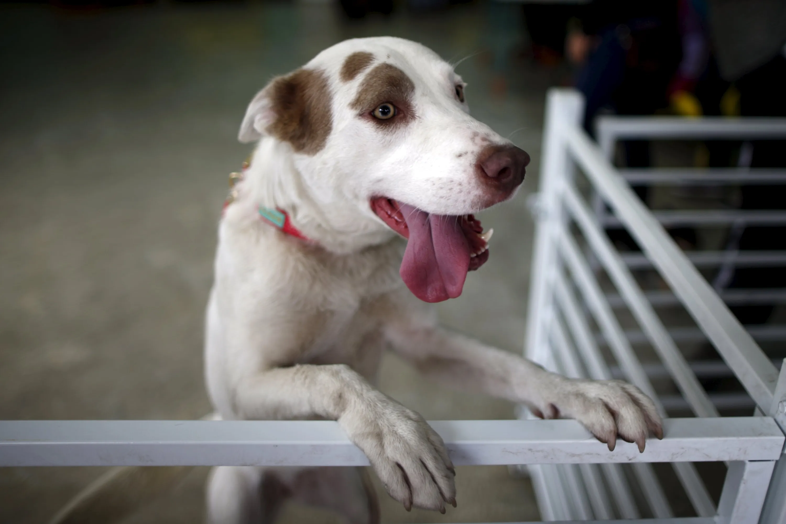 A dog watches as customers to arrive on the opening day of Dog Cafe, a coffee shop where people can adopt shelter dogs in Los Angeles, California, United States, April 7, 2016. (Photo by Lucy Nicholson/Reuters)