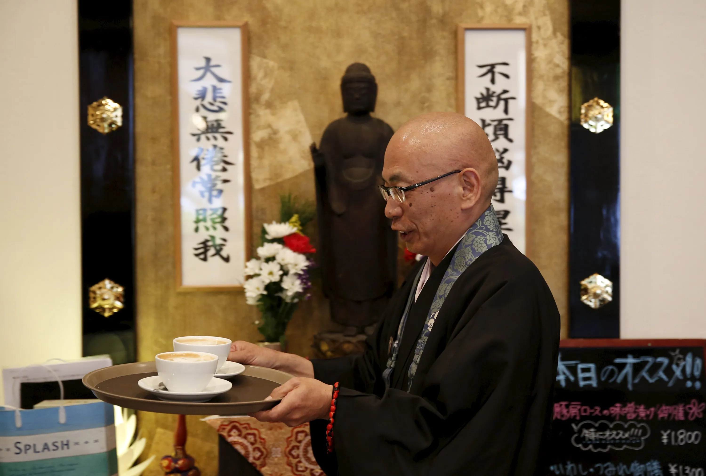 Shokyo Miura, a Buddhist monk and one of the on-site priests, carries cups of coffee past a statue of Buddha at Tera Cafe in Tokyo, Japan, April 1, 2016. (Photo by Yuya Shino/Reuters)