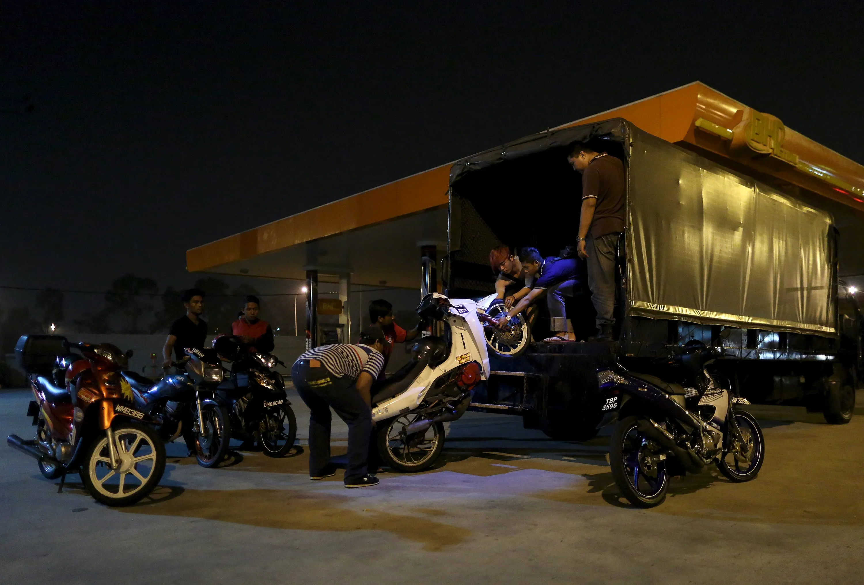 Men load their motorbikes onto a truck after they were confiscated by police on a highway in Kuala Lumpur, Malaysia, September 14, 2014. (Photo by Olivia Harris/Reuters)
