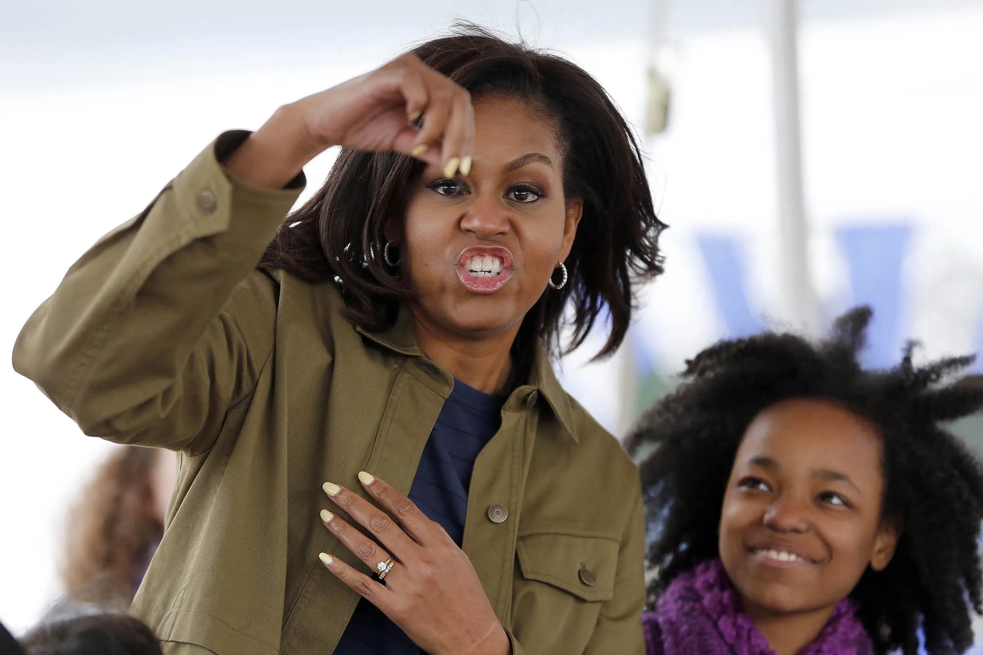 Firs lady Michelle Obama, left, pulls a worm from a bucket of soil as Yasmeena Sharif, a fifth grade student at Philip's Academy Charter School, watches during a visit as part of her American Garden Tour, Thursday, April 7, 2016, in Newark, N.J. (Photo by Julio Cortez/AP Photo)