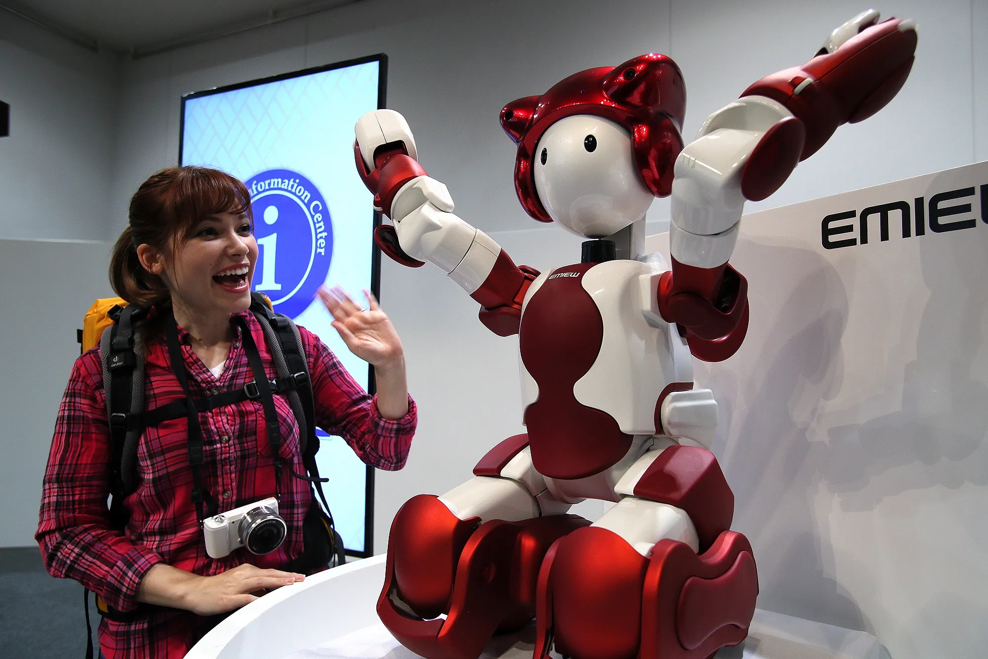 Japanese electronics giant Hitachi unveils the new humanoid robot Emiew3 in Tokyo on Thursday, April 8, 2016. The 90cm tall 15kg Emiew3 enables to move maximum speed of 6km/h and talk with guests interactively. Hitachi will start field tests soon and expects to put the service robot on the market in 2018. (Photo by Aflo/Splash News)