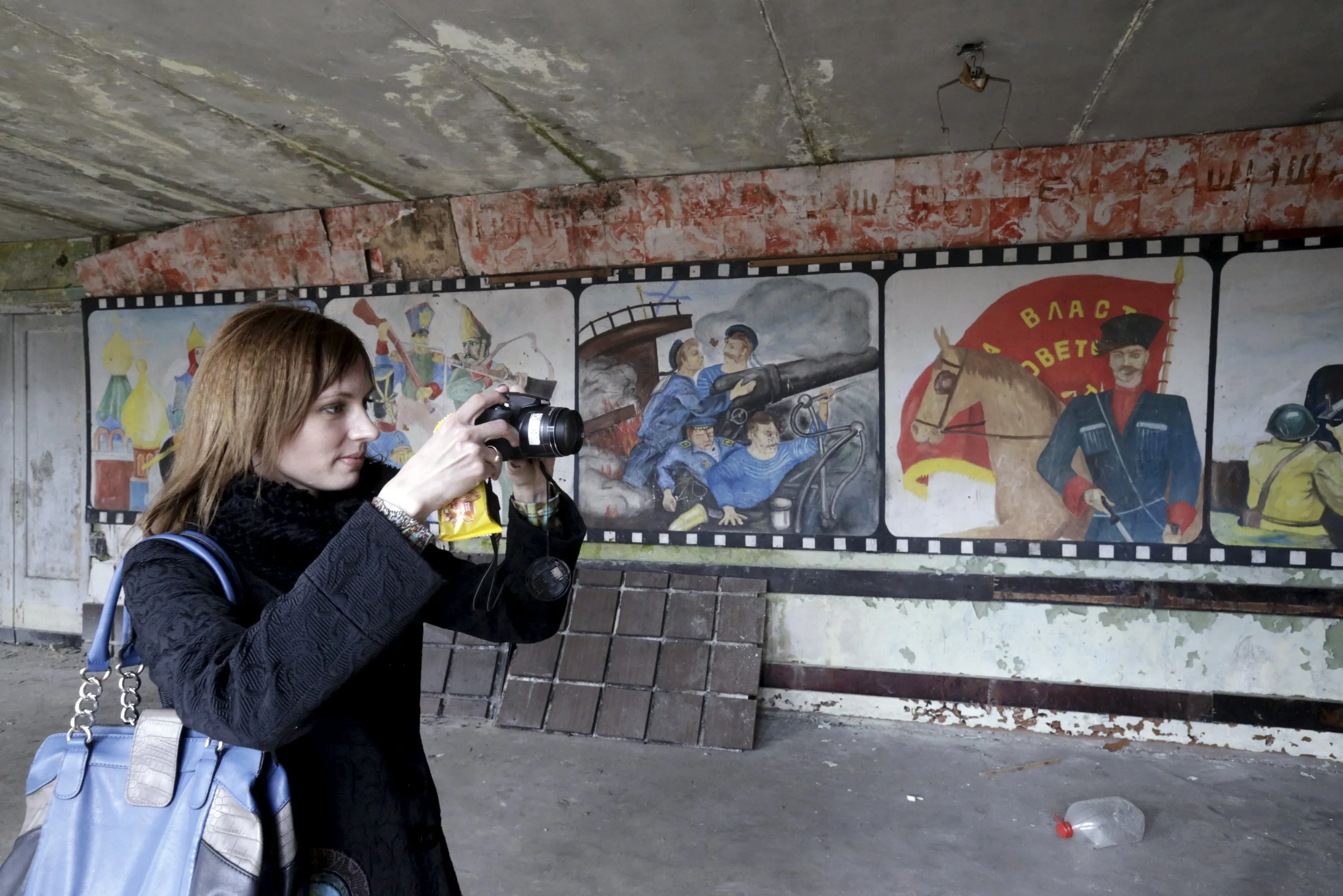 A woman takes a picture inside Soviet propaganda room in the ghost town of a former Soviet military radar station near Skrunda, Latvia, April 9, 2016. (Photo by Ints Kalnins/Reuters)