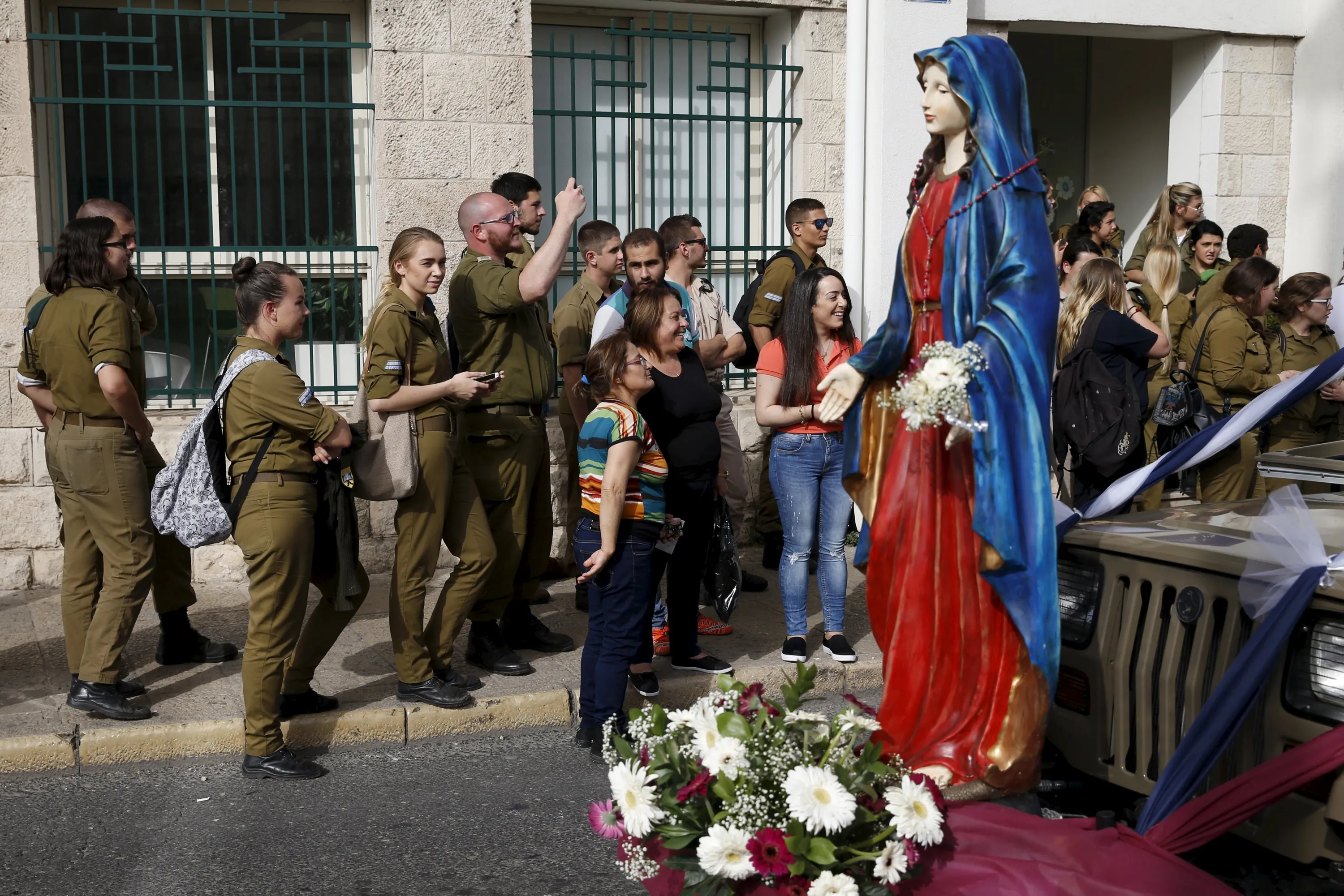 Israeli soldiers watch a statue depicting the Virgin Mary during a procession known as the “Holy Mary procession” in the northern Israel city of Haifa April 10, 2016. (Photo by Baz Ratner/Reuters)