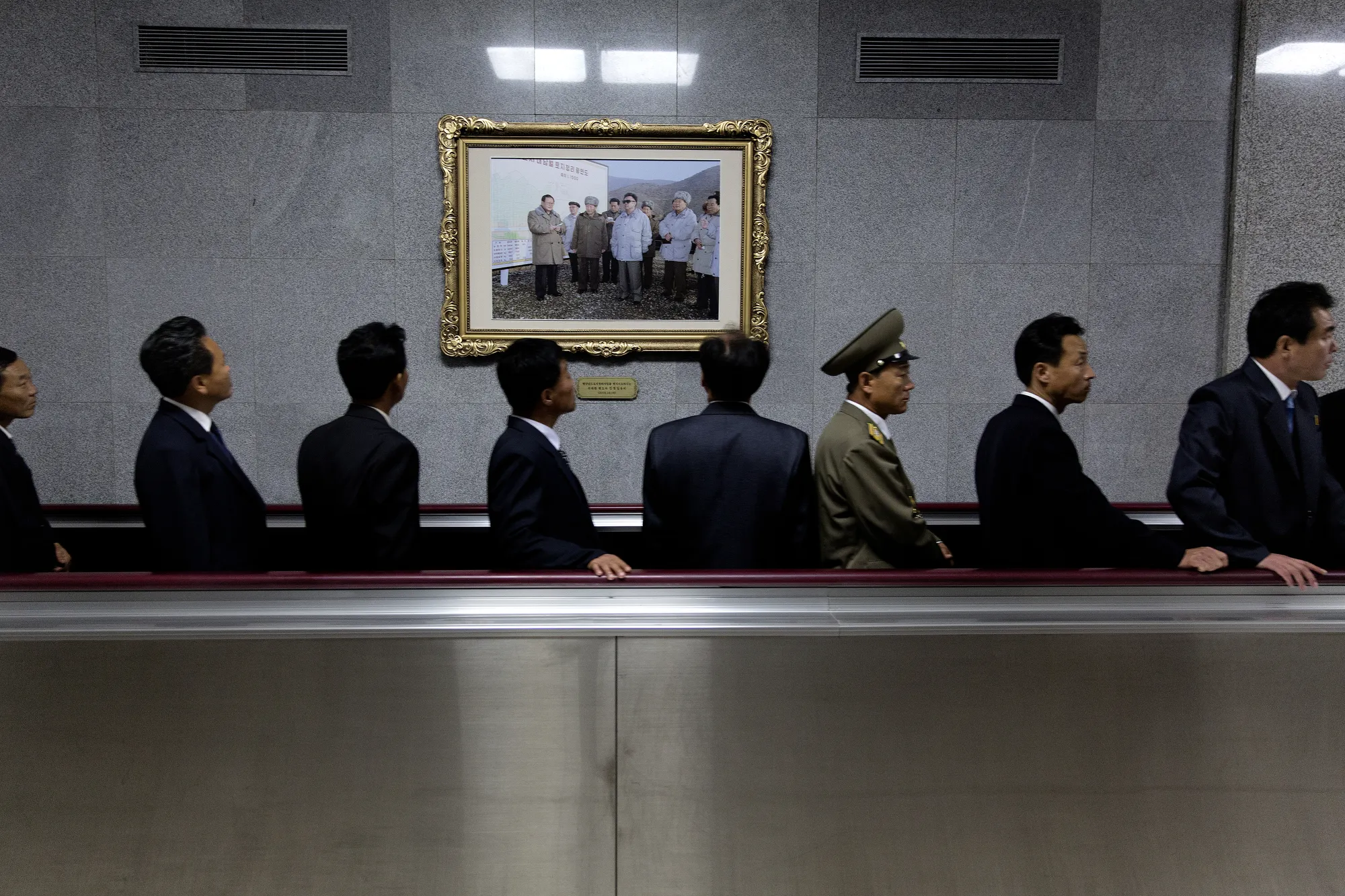 On a moving pavement, men pass a photo of the Dear Leaders in Kumsusan Palace after visiting their bodies which lie, “lit de parade,” or in repose for viewing. Pyongyang is said to have 2.5 million inhabitants. Only the upper caste, known as the core class, is allowed to stay in the capital. In reality, no one outside North Korea knows the exact population. (Photo by Peter Hove Olesen)