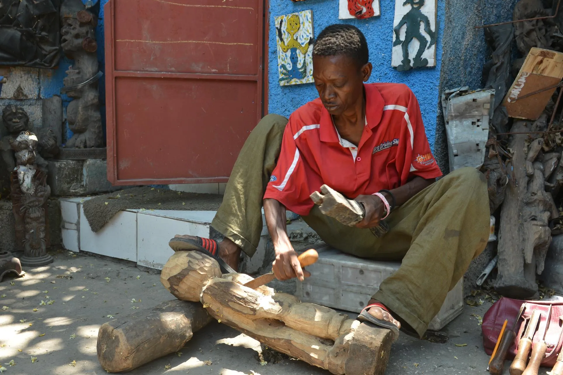 In this April 2, 2016 photo, sculptor Jean Robert Palanquet carves on a piece of wood in an open-air museum and art workshop off a trash-strewn street cutting through some of the poorest neighborhoods in Port-au-Prince, Haiti. Palanquet is a member of a collective of Haitian artists called Atis Rezistans who have become celebrated in the international art world by creating sculptures out of scrapped car parts, old wood, cast-off toys and even human skulls found scattered outside crumbling mausoleums. (Photo by David McFadden/AP Photo)