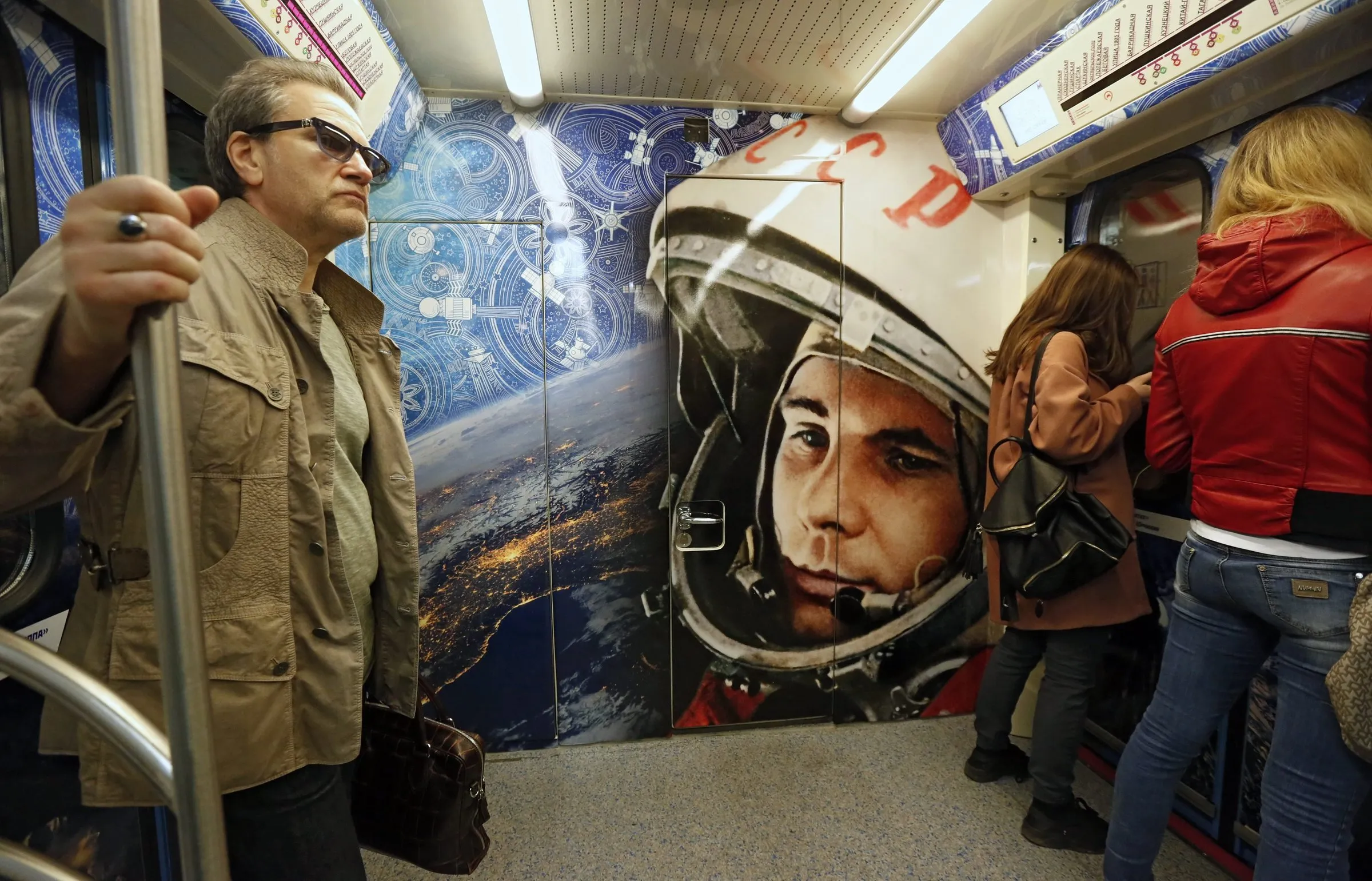 Russian people take the underground in front of a portrait of Yuri Gagarin, the first man in space, in a themed Moscow Metro train marking the 55th anniversary of Yury Gagarin's epic space flight and Cosmonaut Day in Moscow, Russia, 12 April 2016. Moscow Metro in conjunction with the Russian Space Agency launched the “cosmic” train, which is decorated with images of the starry sky, planets and comic ships. Russia is celebrating Cosmonaut Day marking 55 anniversary of Yuri Gagarin's pioneering flight into space on 12 April 1961. (Photo by Sergei Ilnitsky/EPA)