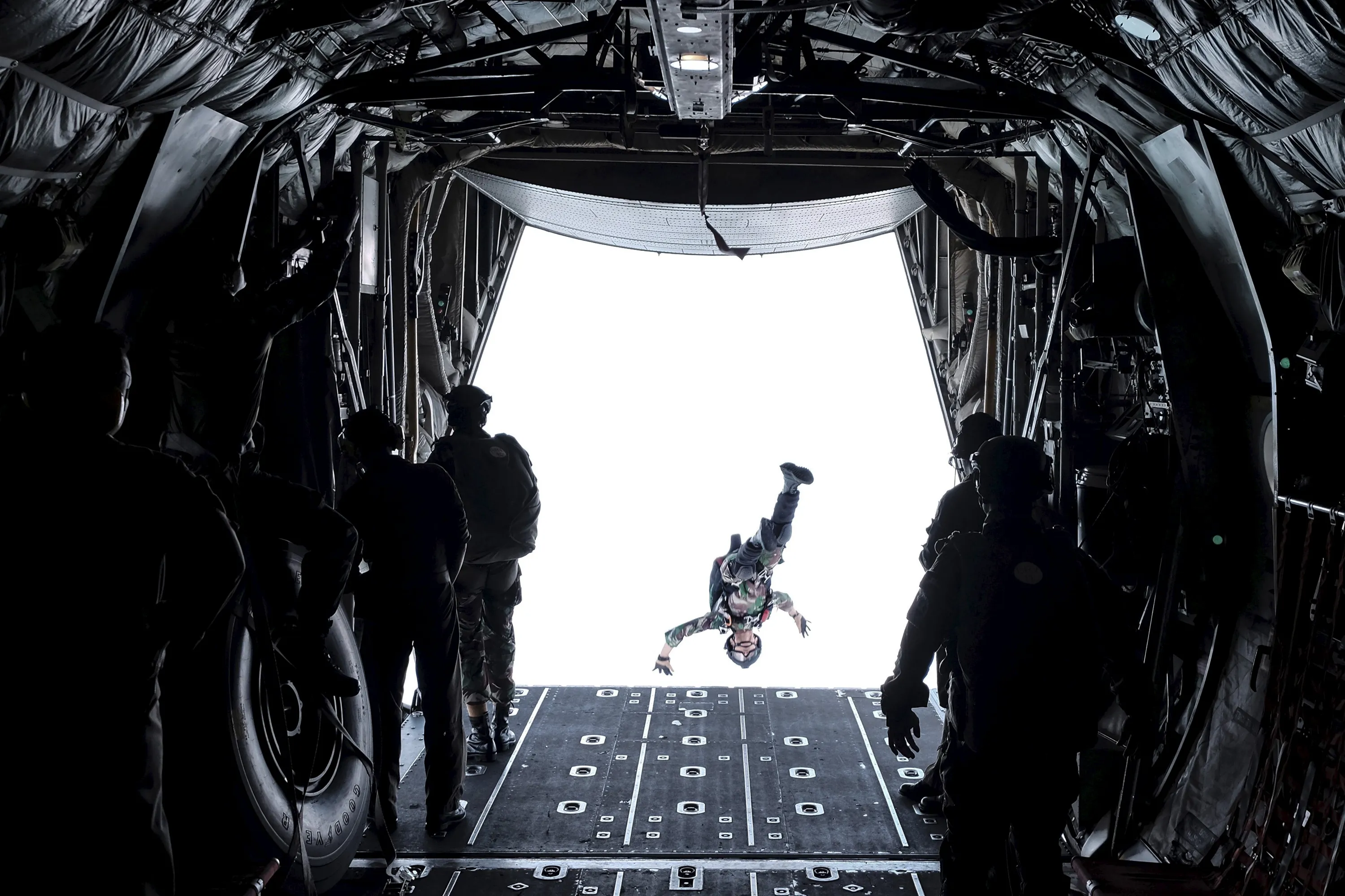 A soldier from Indonesia's Rapid Reaction Strike Force (PPRC) jumps out from the back of an Air Force transport plane during a parachute training exercise in Tarakan, North Kalimantan province, April 13, 2016 in this photo taken by Antara Foto. (Photo by Reuters/Fadlansyah/Antara Foto)