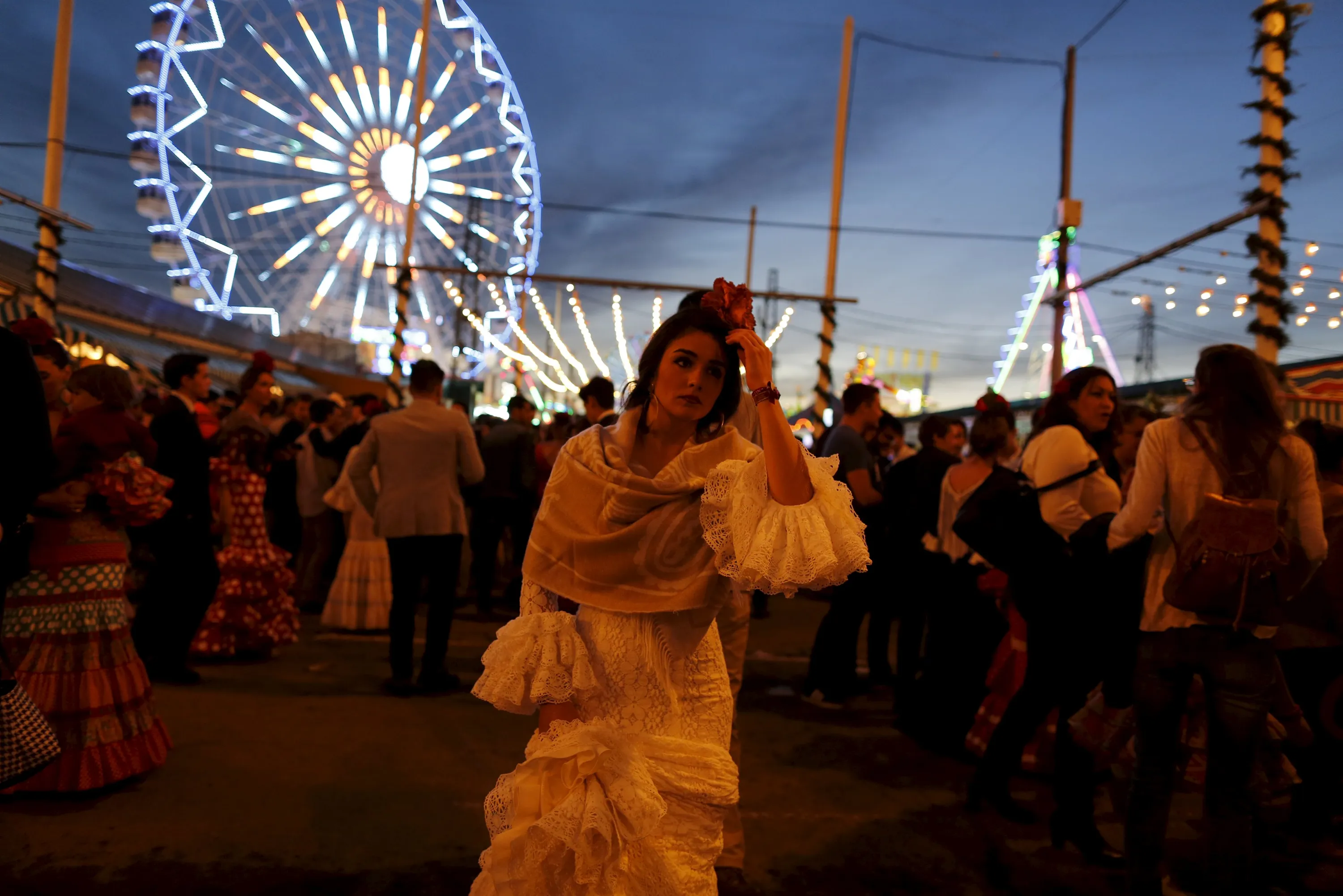 A woman wearing a sevillana dress walks during the traditional Feria de Abril (April fair) in the Andalusian capital of Seville, southern Spain, April 13, 2016. (Photo by Marcelo del Pozo/Reuters)