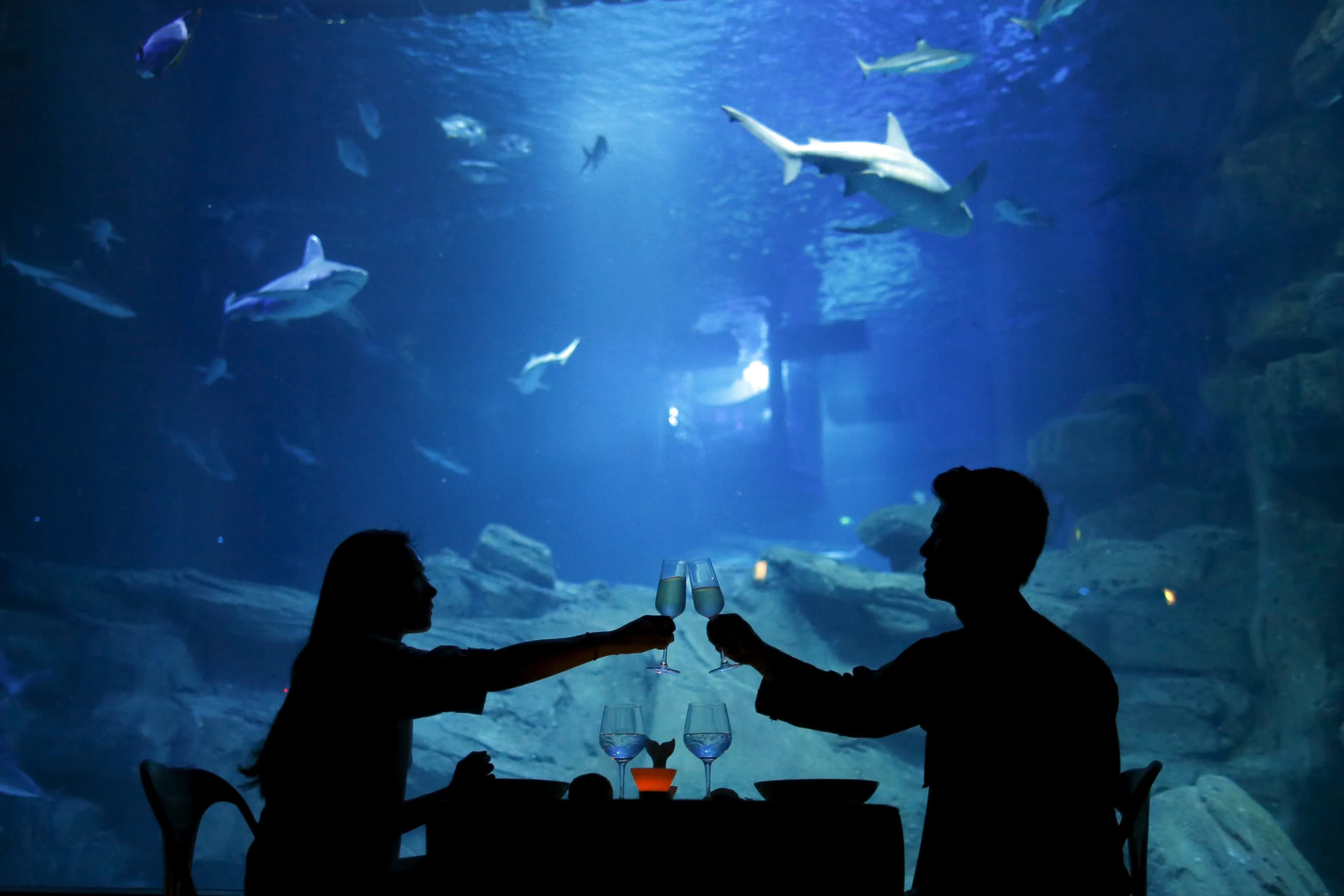 Airbnb contest winners Wu Hao and Tang Di (L) pose as they enjoy a dinner before spending a night among sharks in an underwater structure installed in the Aquarium of Paris, April 13, 2016. (Photo by Charles Platiau/Reuters)