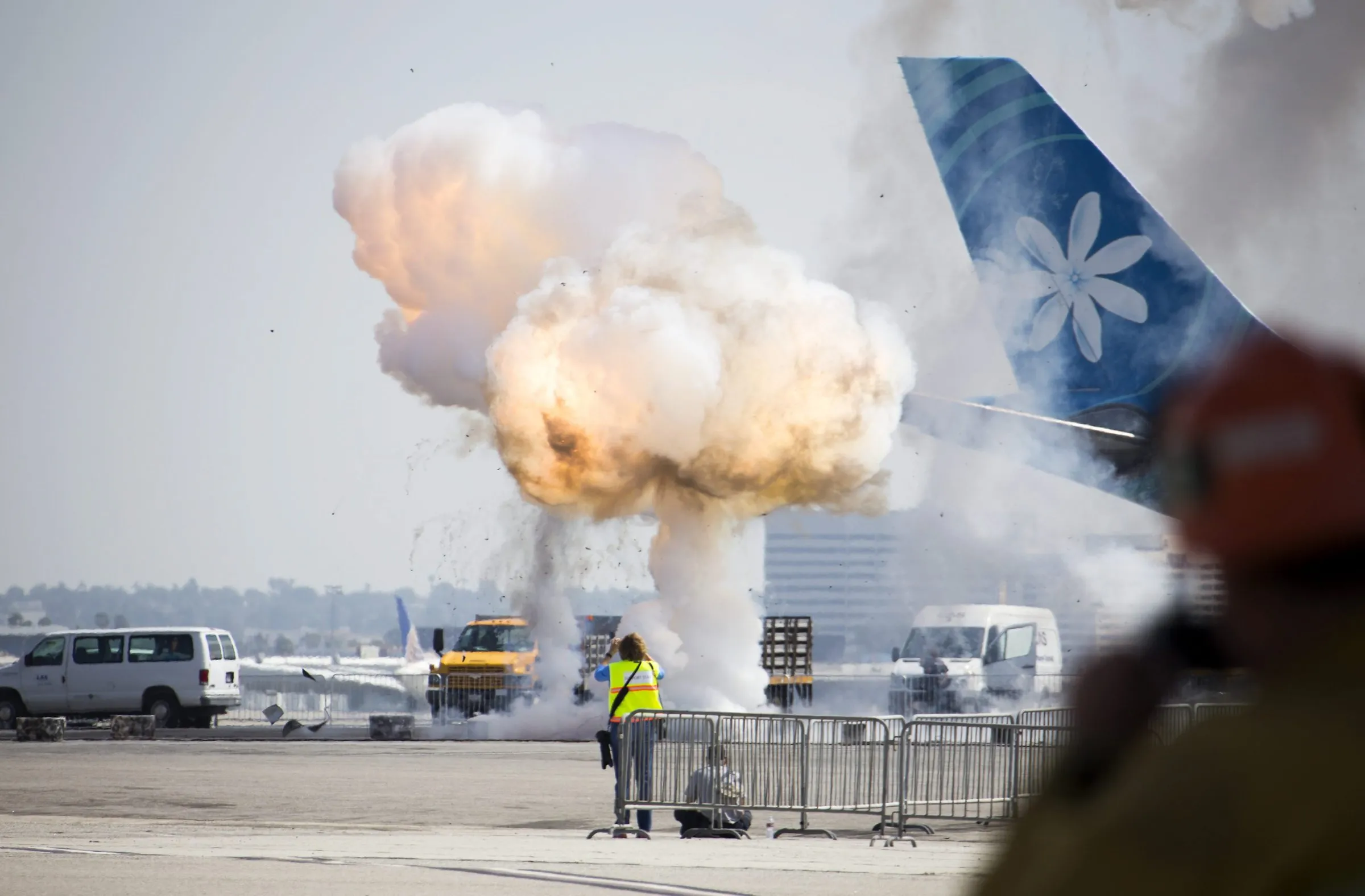 Pyrotechnic explosions goes off near a parked airplane during a disaster drill at Los Angeles International Airport (LAX) in Los Angeles, California, USA, 13 April 2016. A full-scale simulated aircraft crash landing was conducted to test the city and airport's emergency response systems. (Photo by Eugene Garcia/EPA)