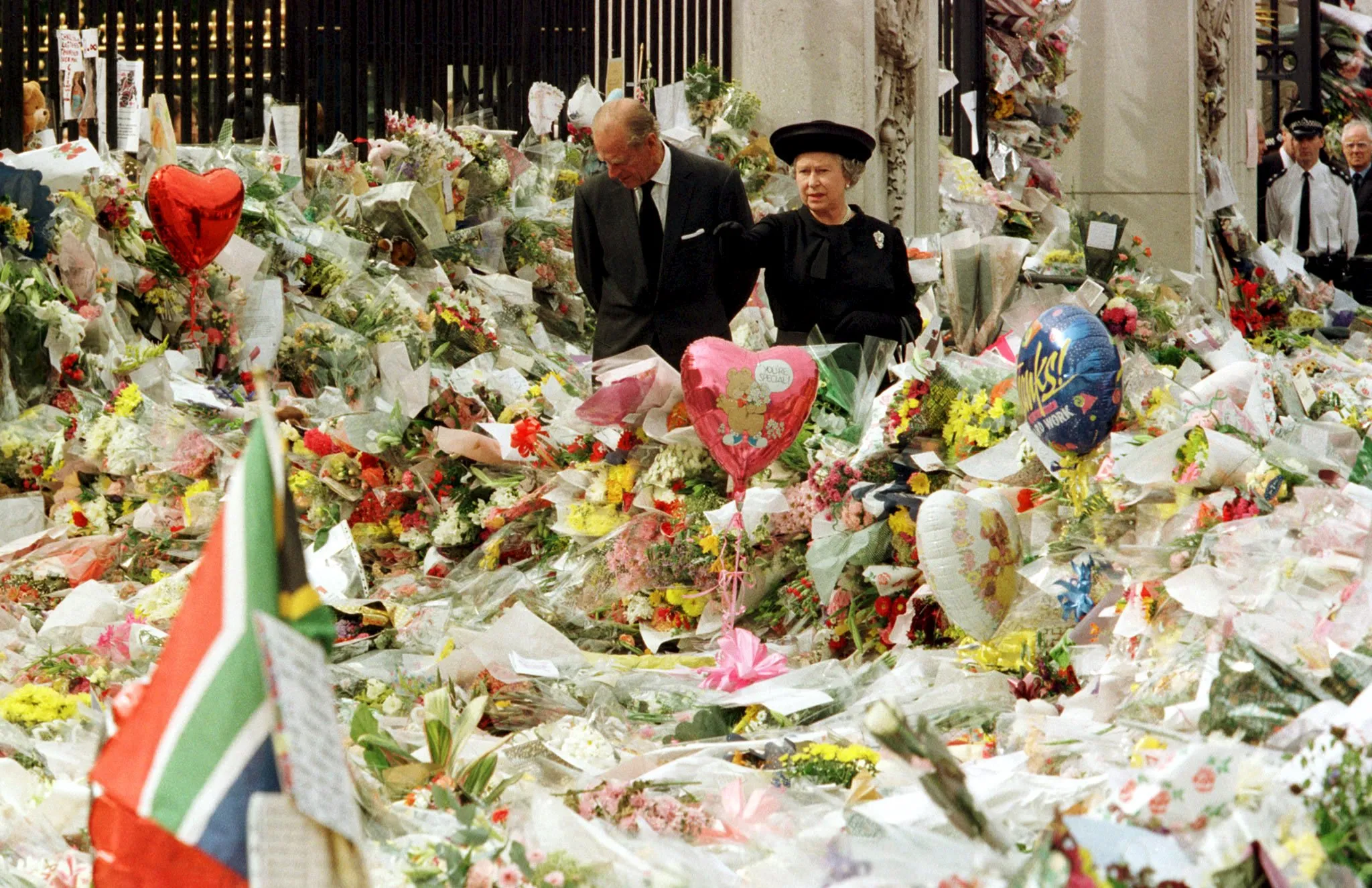 Britain's Queen Elizabeth and the Duke of Edinburgh look at floral tributes laid outside Buckingham Palace in memory of Diana, Princess of Wales, London, in this September 5, 1997 file photo. (Photo by Ian Waldie/Reuters)