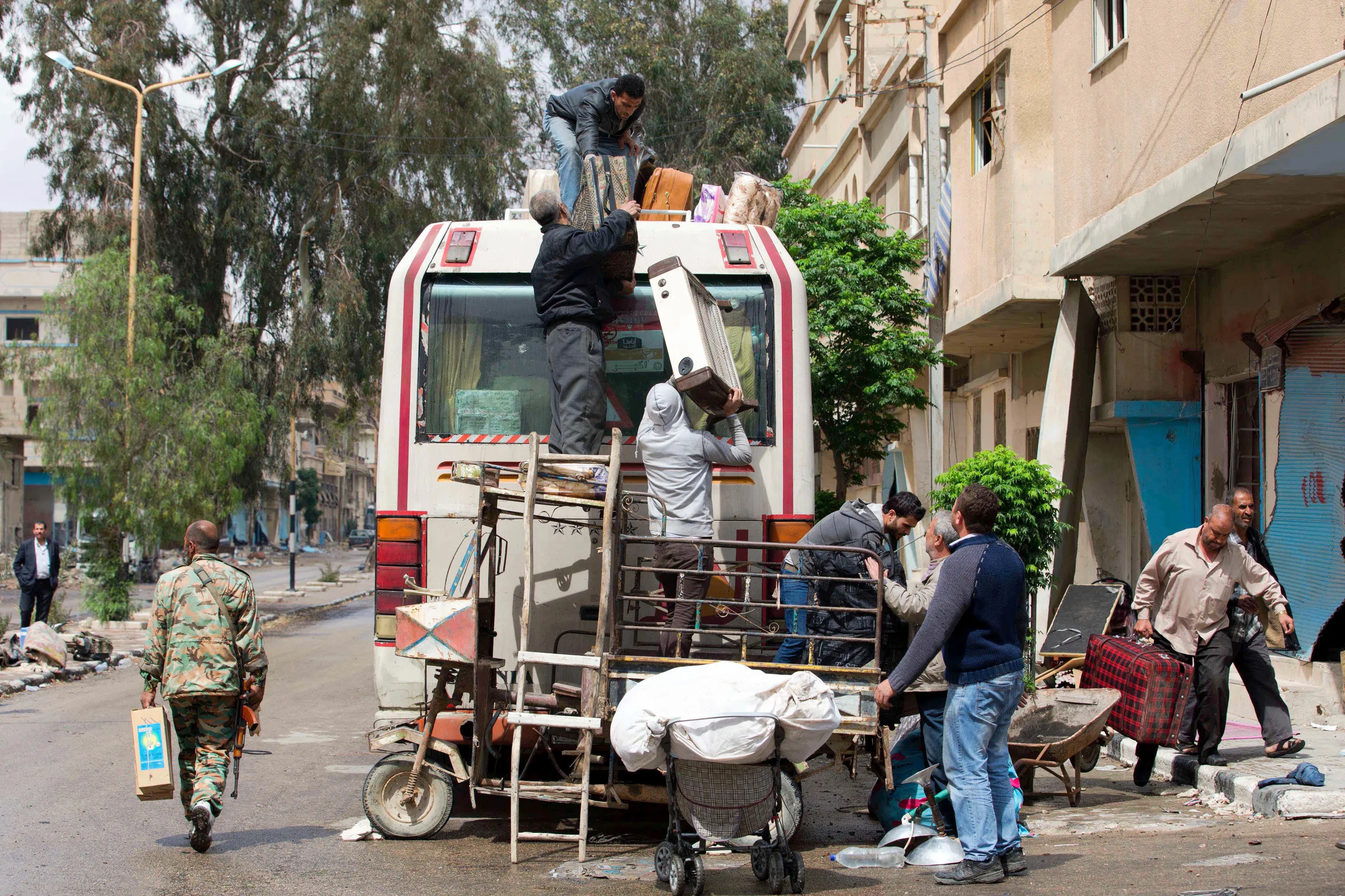 In this picture taken Thursday, April 14, 2016, Syrian families load their belongings onto a bus in the town of Palmyra in the central Homs province, Syria. (Photo by Hassan Ammar/AP Photo)