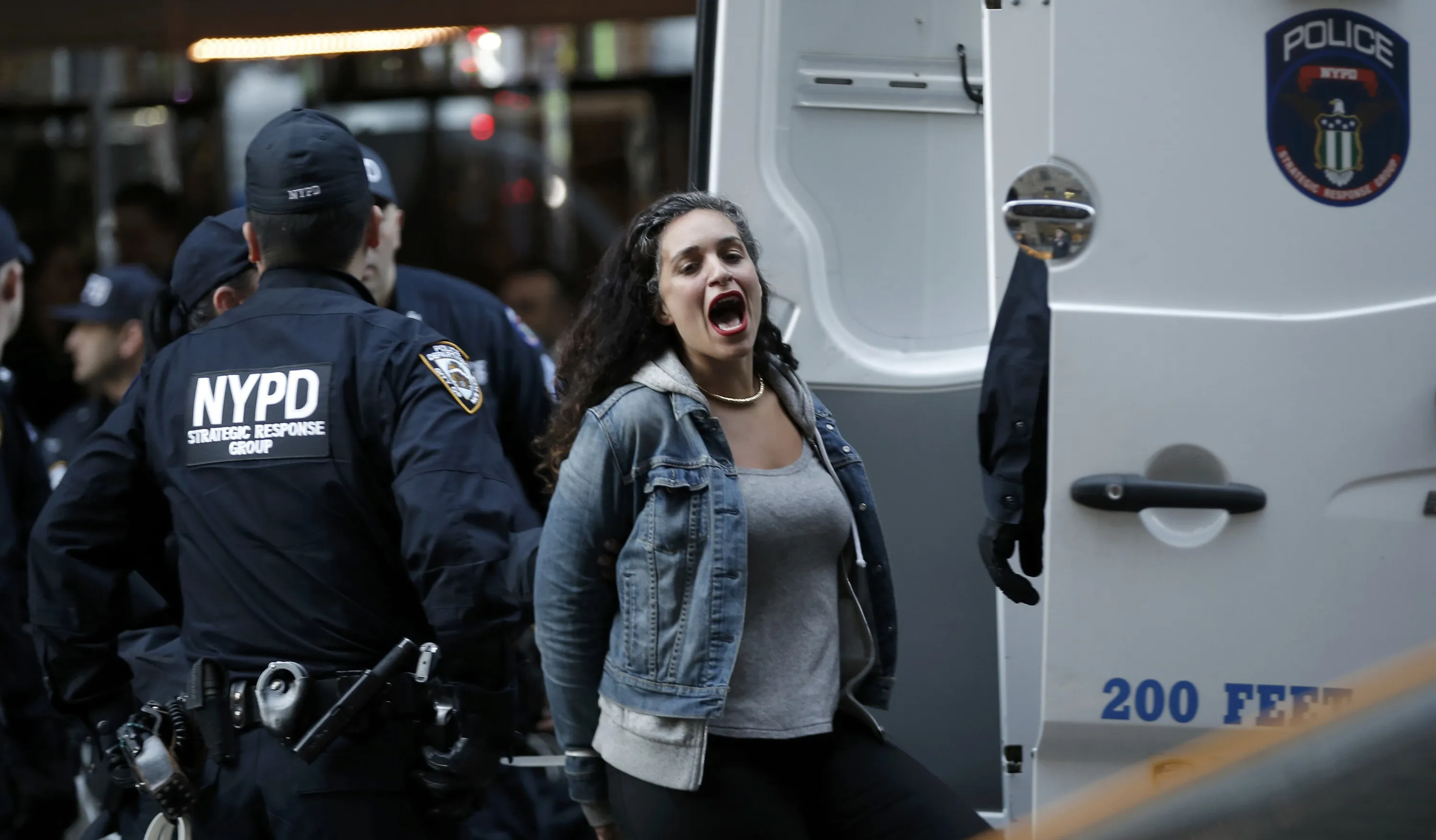A demonstrator is loaded into a police van after being detained inside the venue of the 2016 New York State Republican Gala while protesting against the Republican U.S. presidential candidate Donald Trump in midtown Manhattan in New York City, April 14, 2016. (Photo by Mike Segar/Reuters)