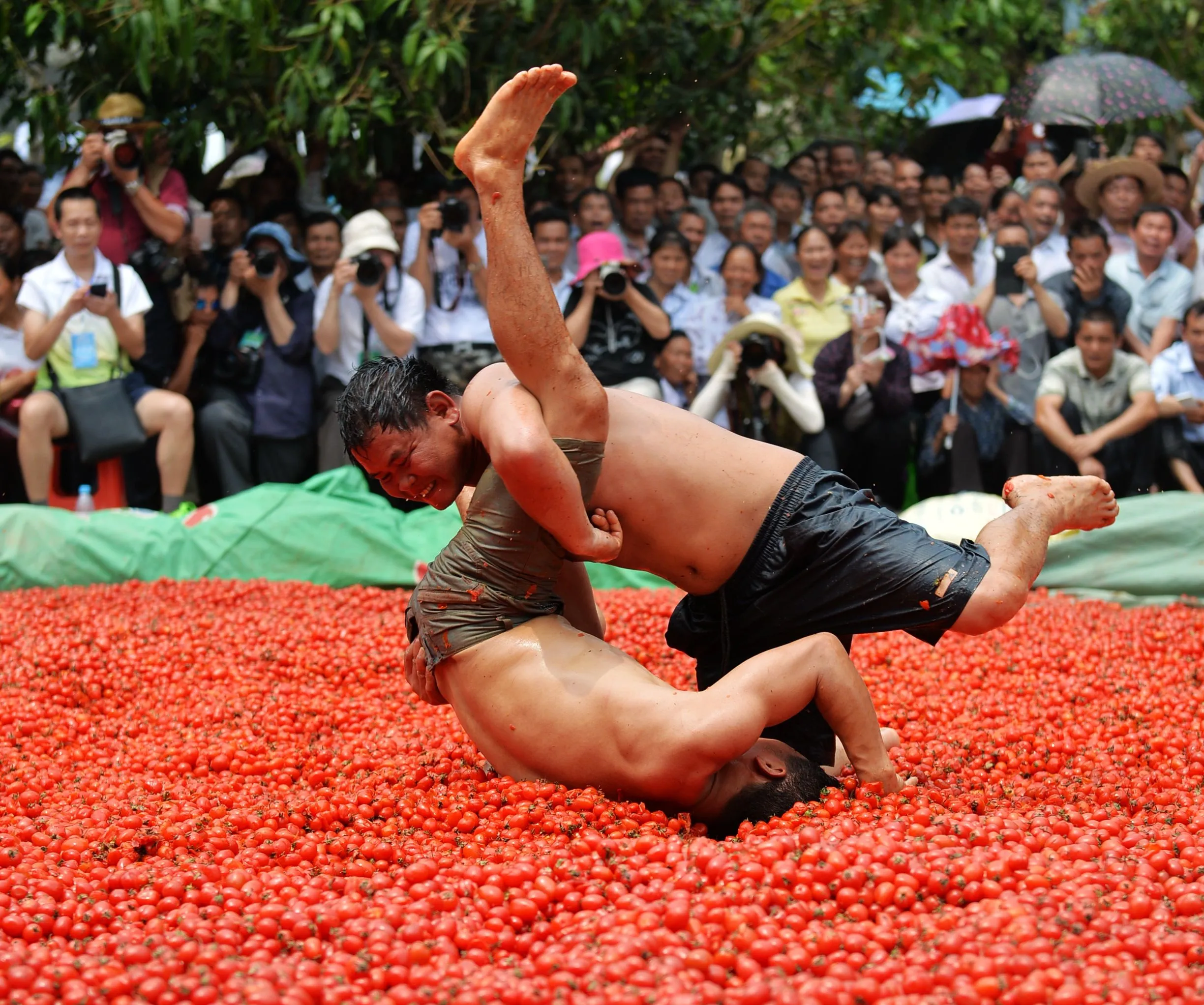 Villagers wrestle in a pool filled with cherry tomatoes to celebrate the fruit’s harvest in Guangxi Zhuang, China on April 14, 2016. (Photo by Imaginechina/Rex Features/Shutterstock)