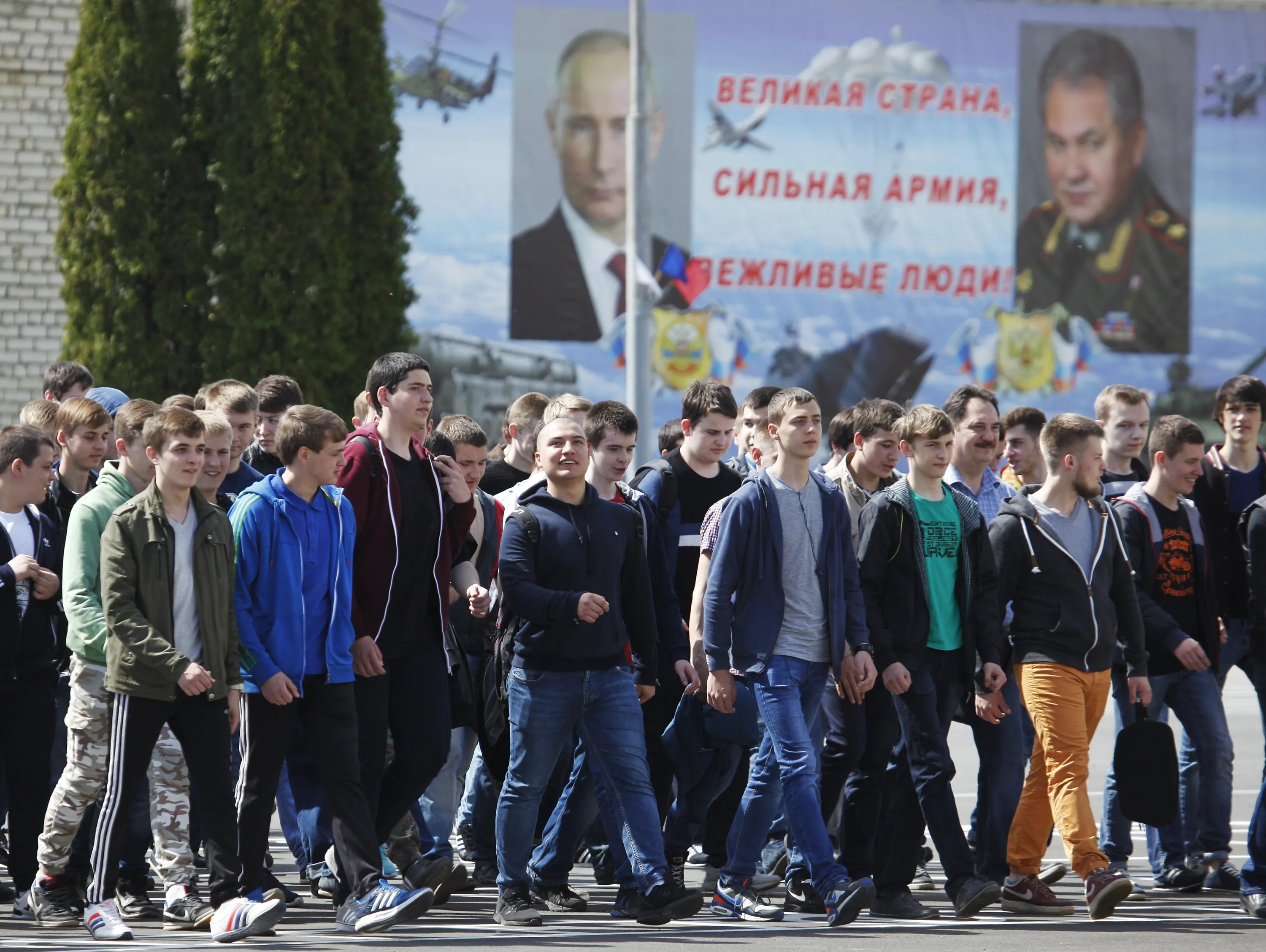 High school students, who are potential conscripts, walk under the portraits of Russian President Vladimir Putin (L) and Defence Minister Sergei Shoigu during an open army day at a military base in Stavropol, Russia, April 15, 2016. The sign reads:"Great country, Strong army, Polite people!". REUTERS/Eduard Korniyenko