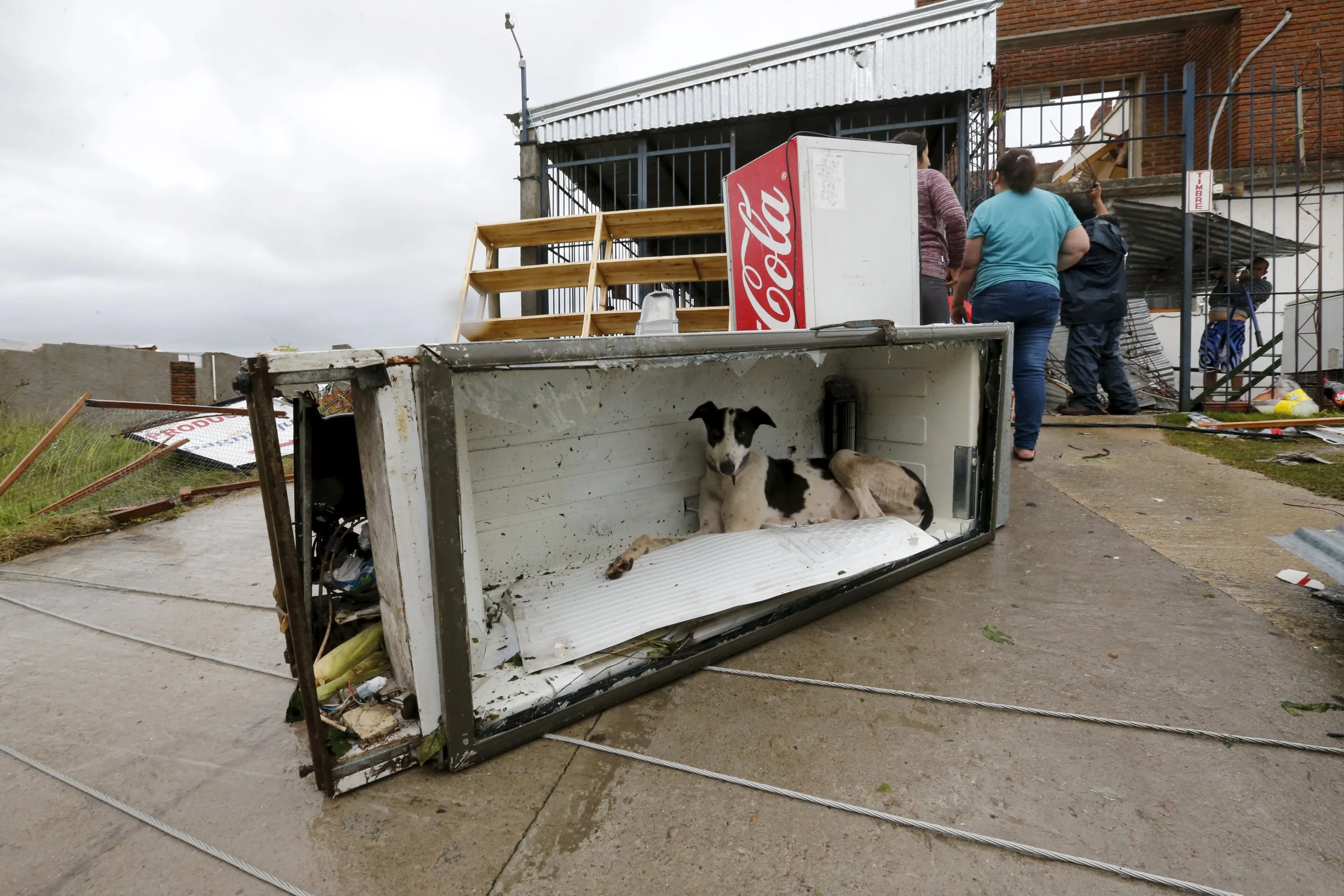 A dog rests in a broken fridge along a street in Dolores, the day after the city was hit by a tornado, April 16, 2016. (Photo by Andres Stapff/Reuters)