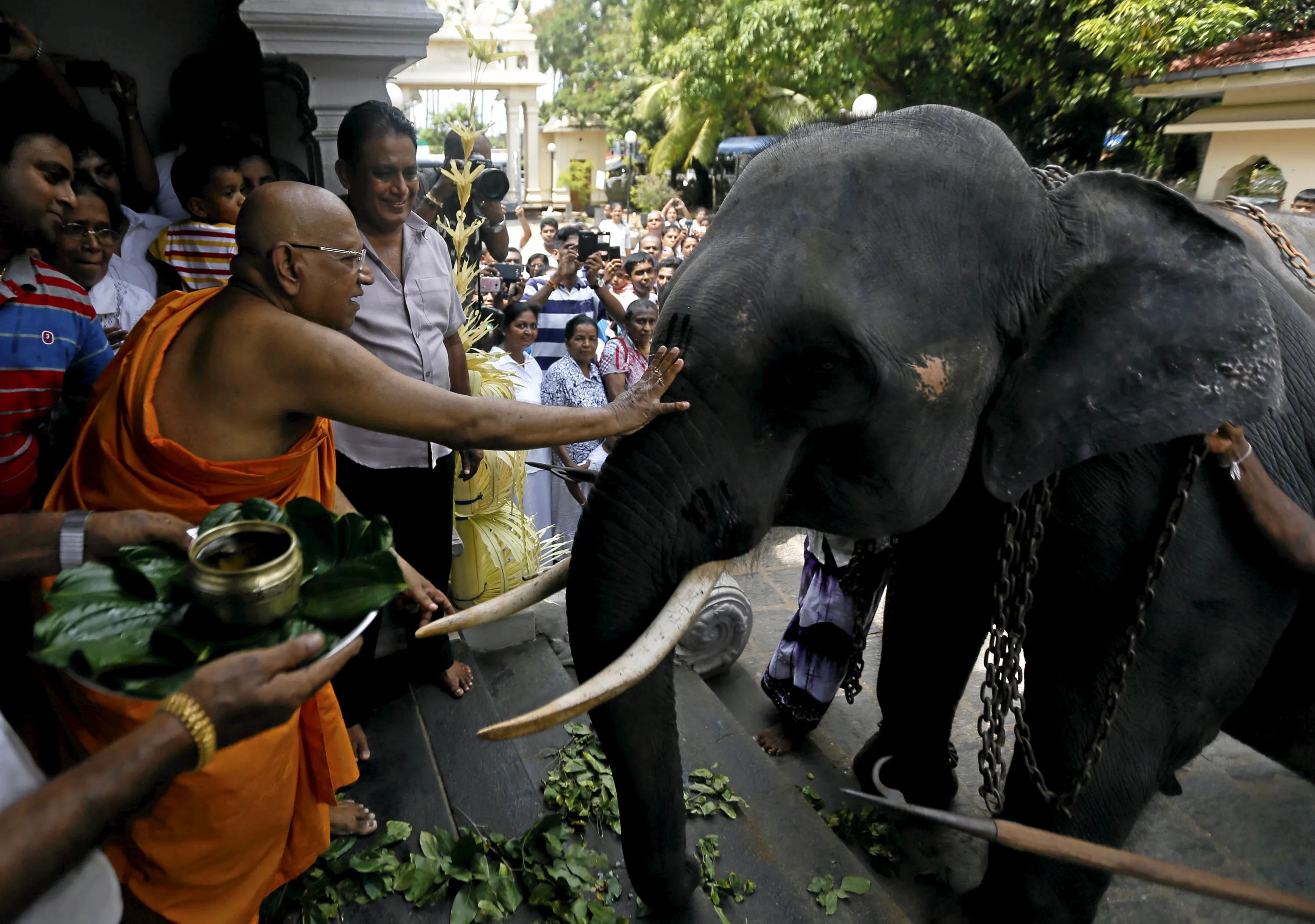 Bellanwila Wimalaratana, chief Buddhist monk of the Bellanwila temple, prepares to bless the temple's elephant during a ceremony as part of the Sinhala, Hindu and Tamil new year celebrations in Boralasgamuwa April 16, 2016. (Photo by Dinuka Liyanawatte/Reuters)