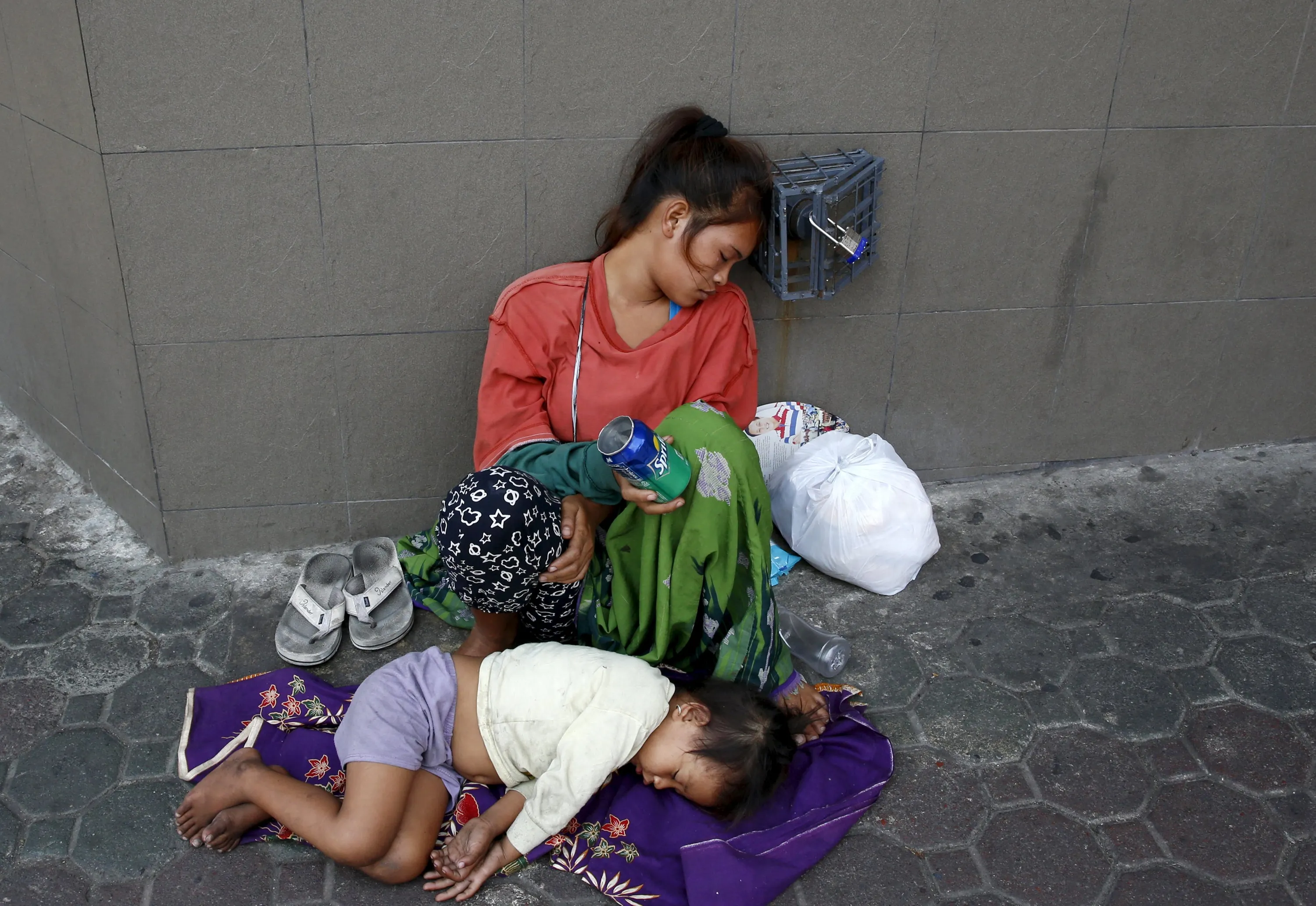 A mother and her child sleep along a sidewalk as they beg for money in the mountain resort of Baguio city in northern Philippines, April 16, 2016. (Photo by Erik De Castro/Reuters)
