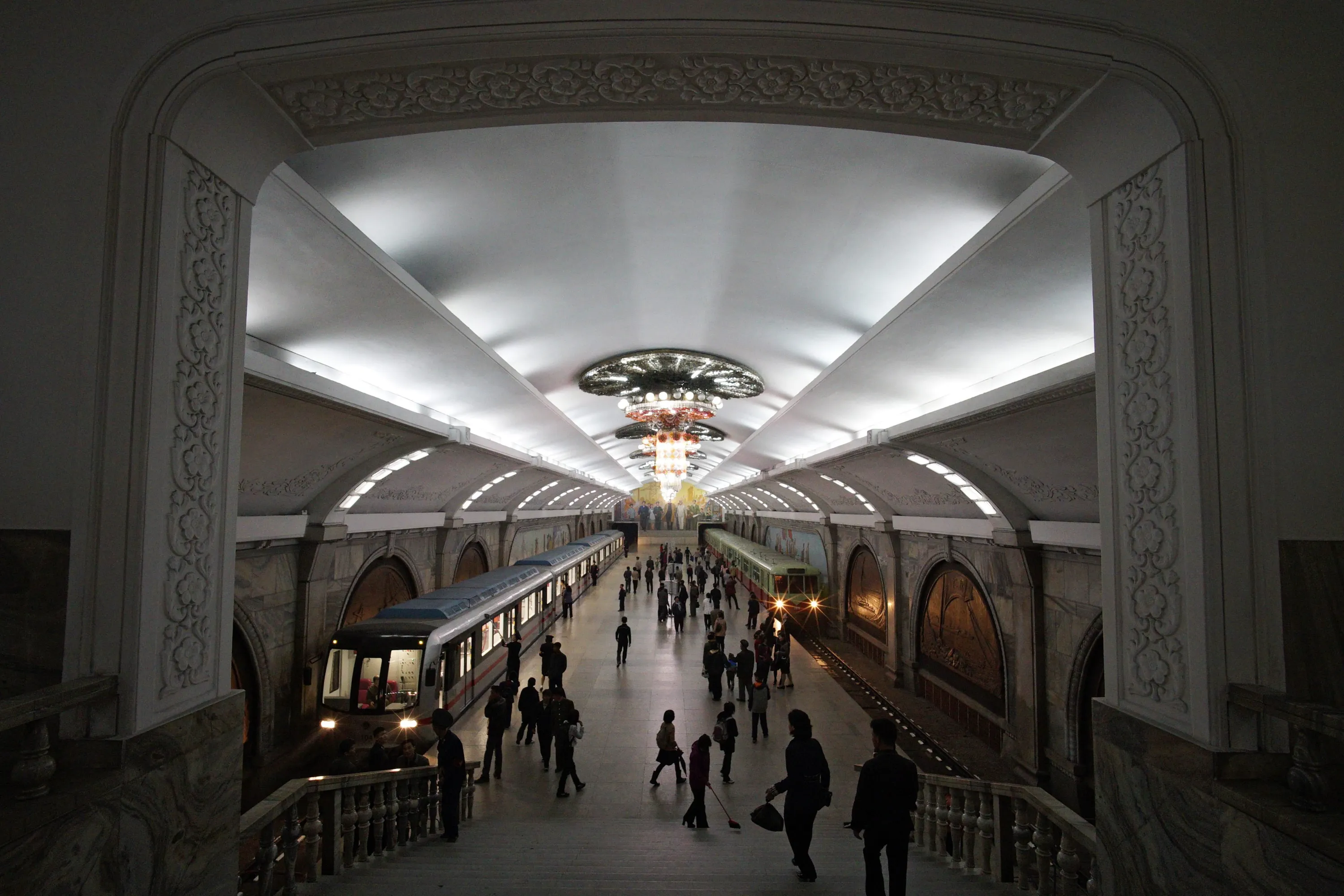 Picture taken 13 April 2016 and made available 16 April 2016 shows people on the platform at the Puhung metro station in Pyongyang, North Korea. One of the deepest metros in the world, the metro in Pyongyang consists of two lines and recently introduced new trains. (Photo by Franck Robichon/EPA)