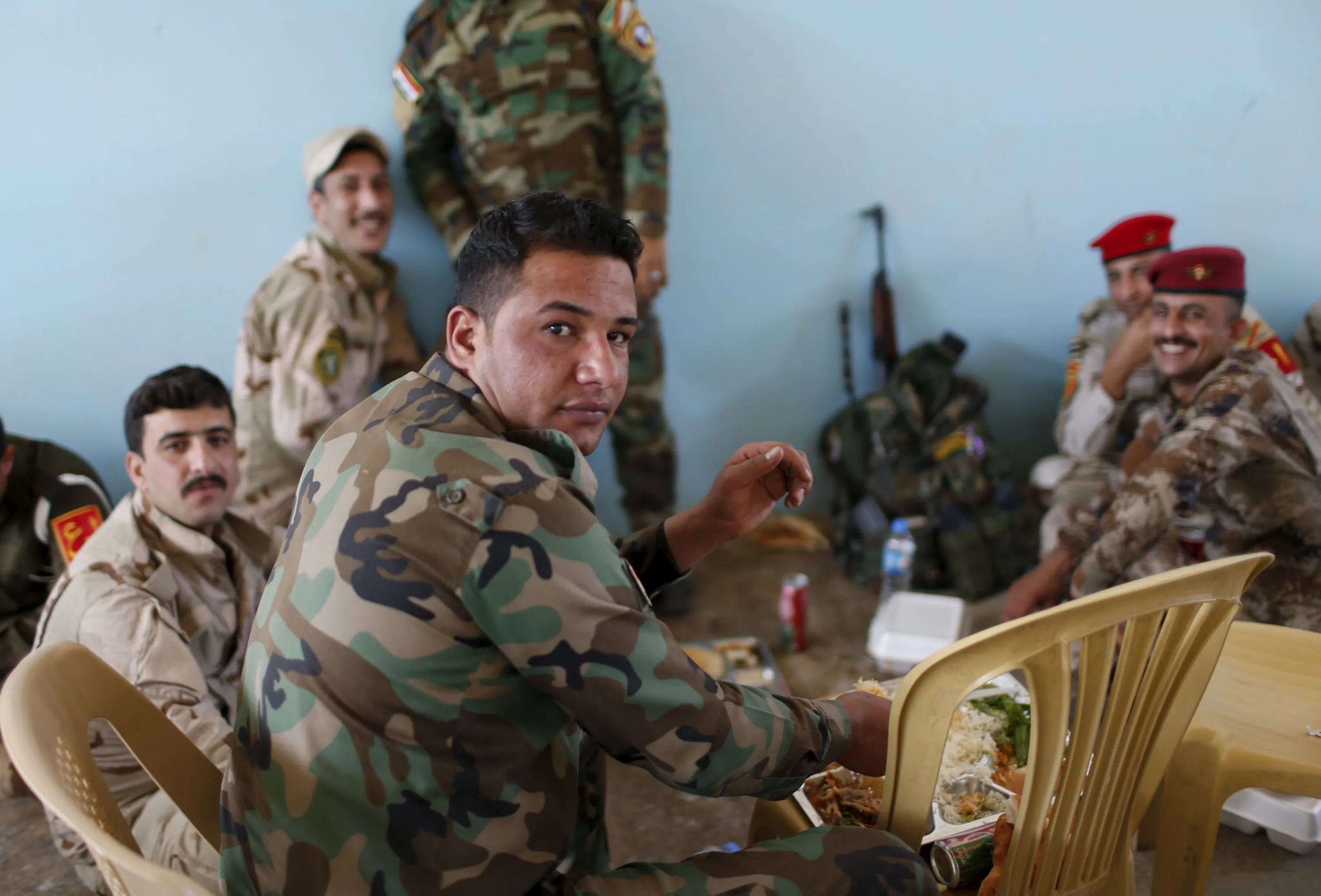 Iraqi soldiers have their lunch at their base in Makhmour, after it was freed from control of Islamic State, south of Mosul, April 17, 2016. (Photo by Ahmed Jadallah/Reuters)