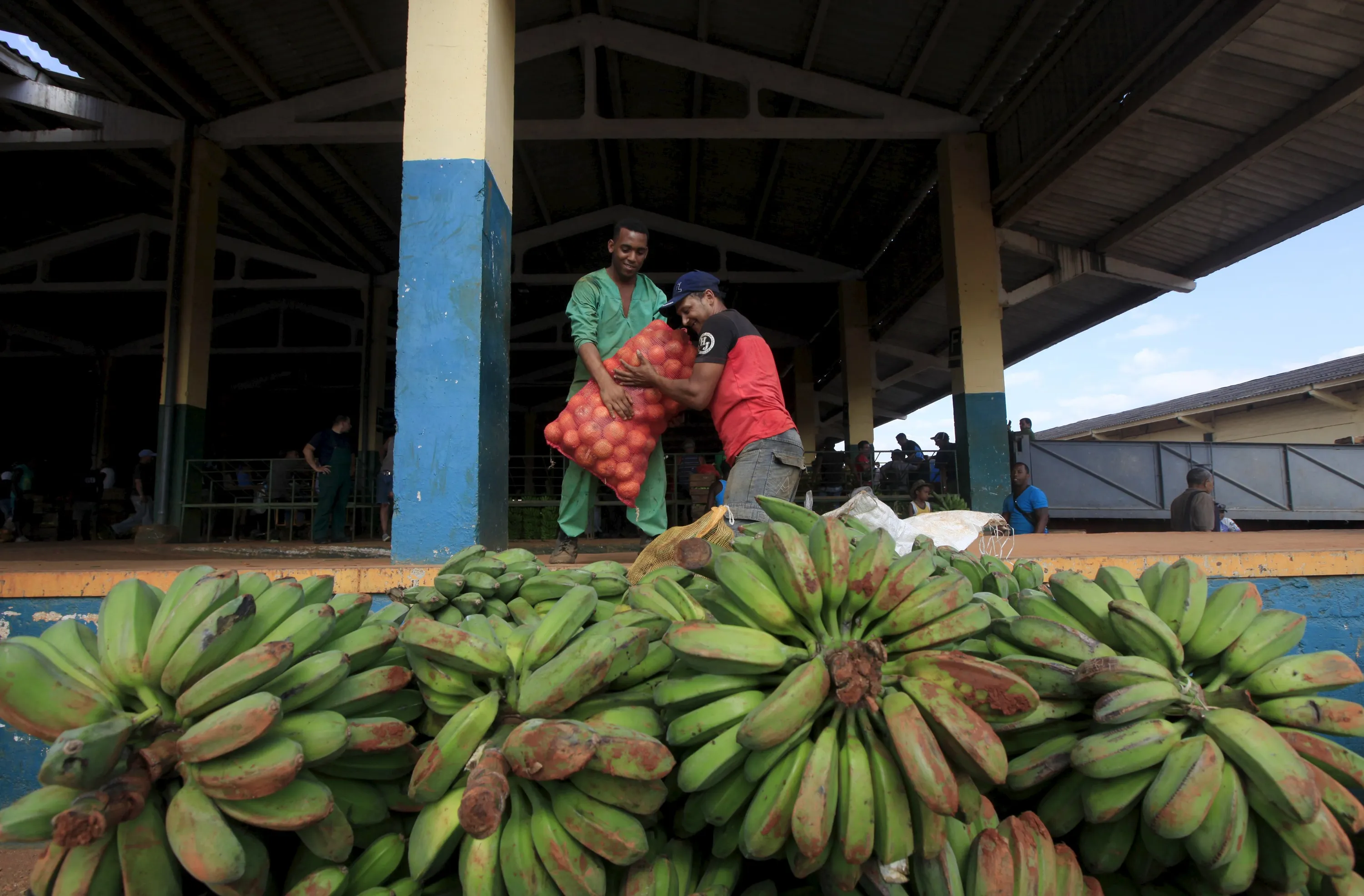 Men carry a bag with oranges at a wholesale market in Havana April 13, 2016. (Photo by Enrique de la Osa/Reuters)