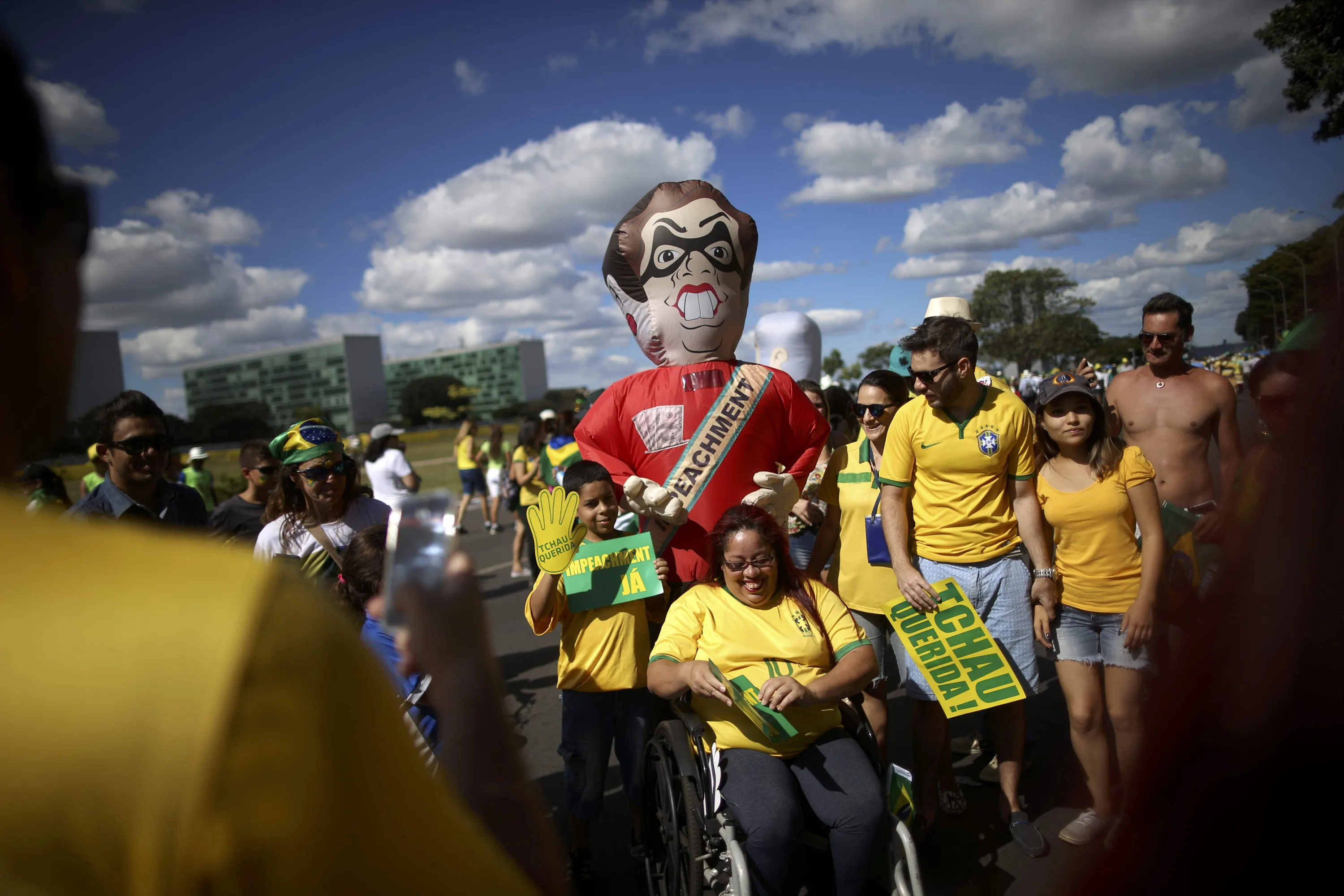 Brazilians demonstrate for the impeachment of President Dilma Rousseff with an inflatable doll known as “Pixuleco” as the Lower House of Congress voted in Brasilia, Brazil April 17, 2016. (Photo by Adriano Machado/Reuters)