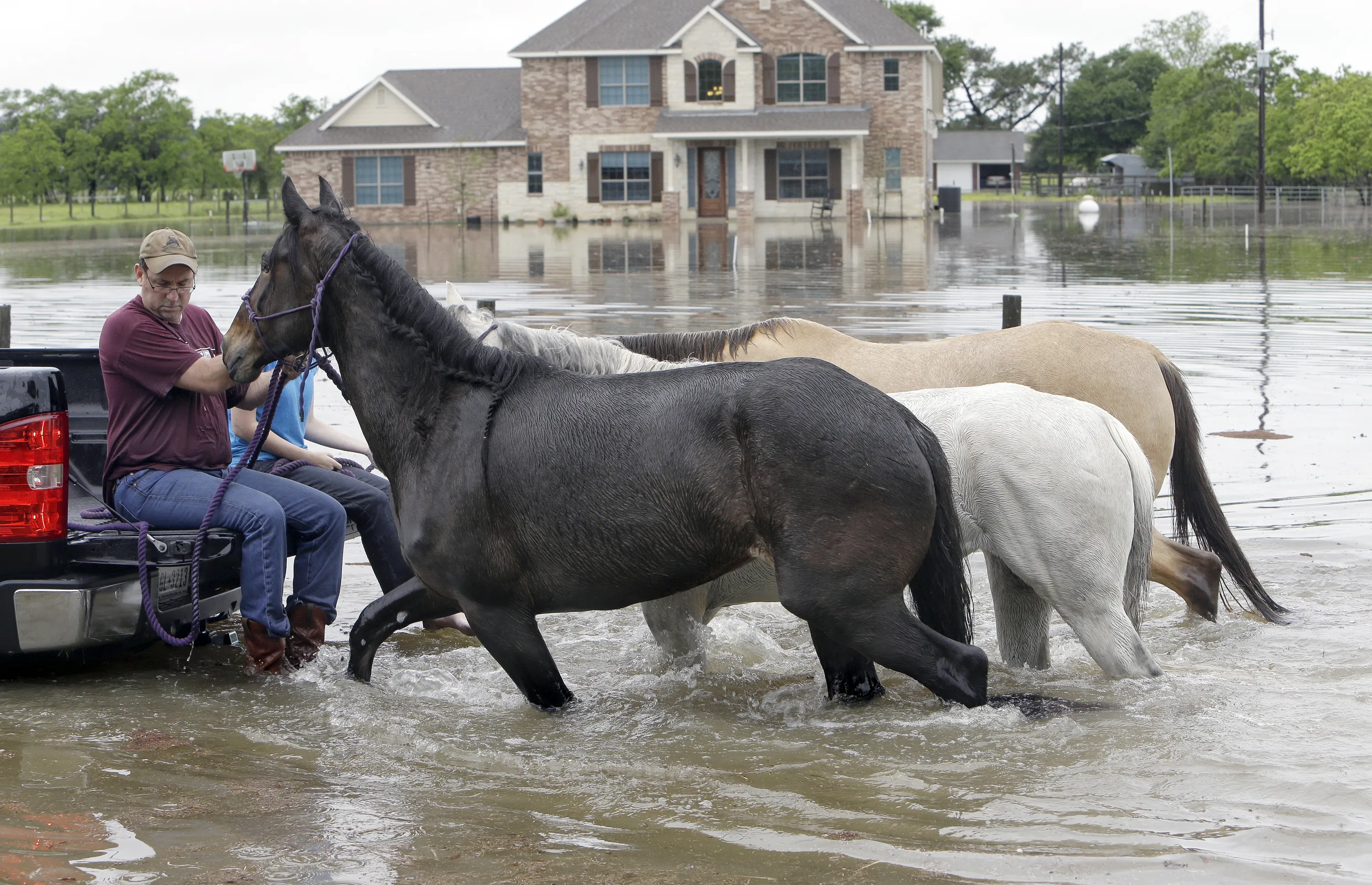 Richard Lopez and Allie Hairford-Siemens hold the reins of three horses as they lead them from the back of truck through flood water along Cypress Rosehill Rd. in Cypress, Texas, Monday, April 18, 2016. The three horses were last removed from stalls at Cypress Equestrian Center. They are working on what to do with the more than 30 horses in a pasture. (Photo by Melissa Phillip/Houston Chronicle via AP Photo)