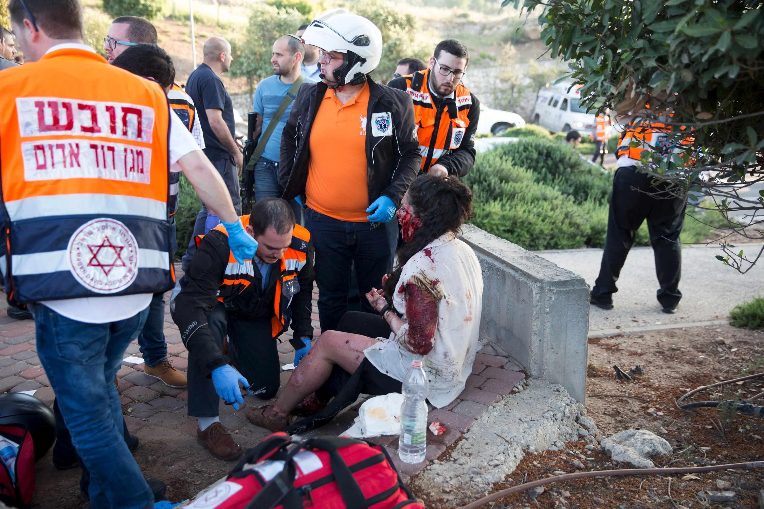Israeli emergency workers help an injured woman at the scene where an explosion tore through a bus in Jerusalem on Monday setting a second bus on fire, in what an Israeli official said was a bombing, April 18, 2016. (Photo by Noam Revkin Fenton/Reuters)