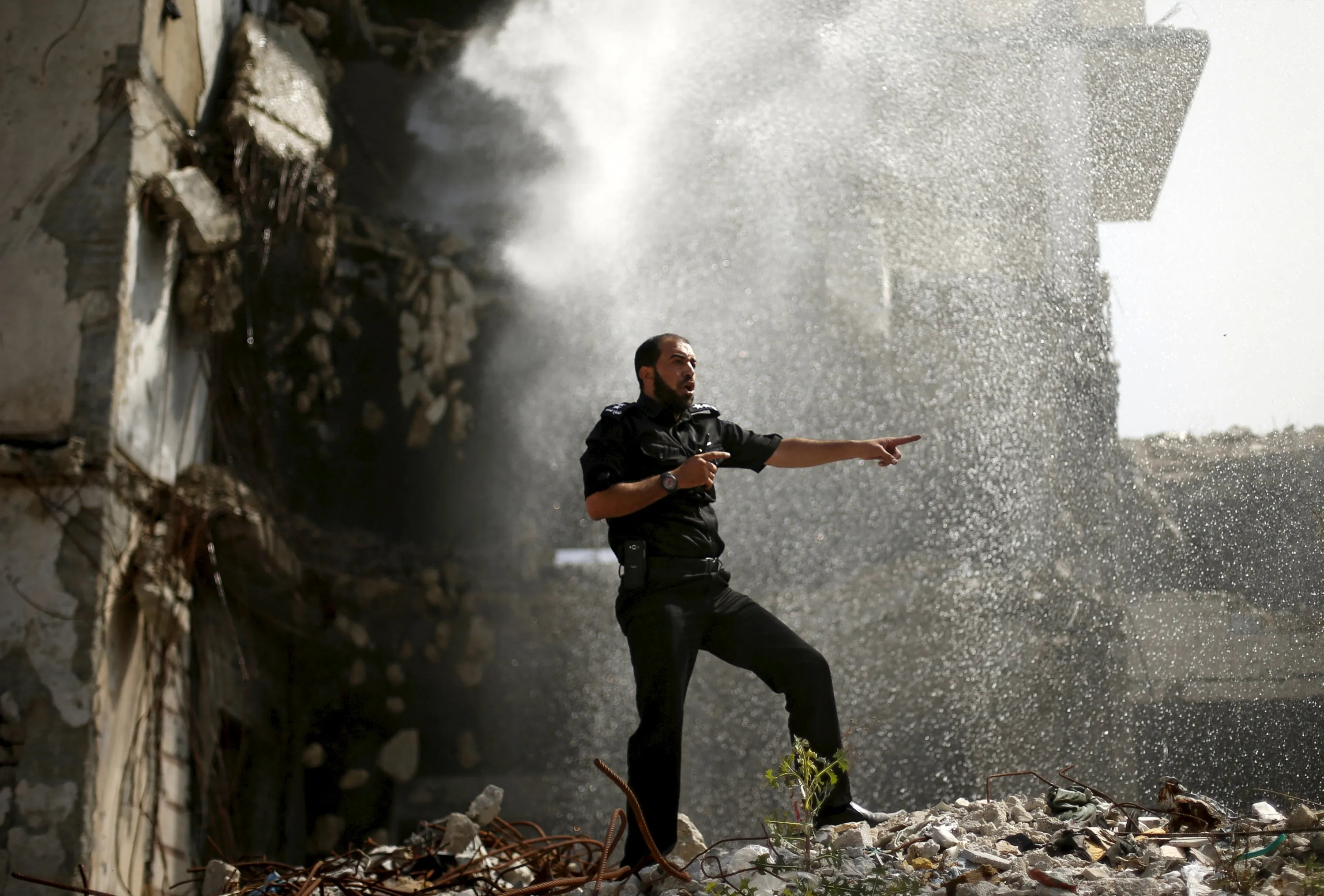 A member of Palestinian security forces loyal to Hamas reacts during a reenactment of evacuation scene at a drill, in front of a building destroyed during the 2014 war, in Gaza City April 19, 2016. (Photo by Suhaib Salem/Reuters)