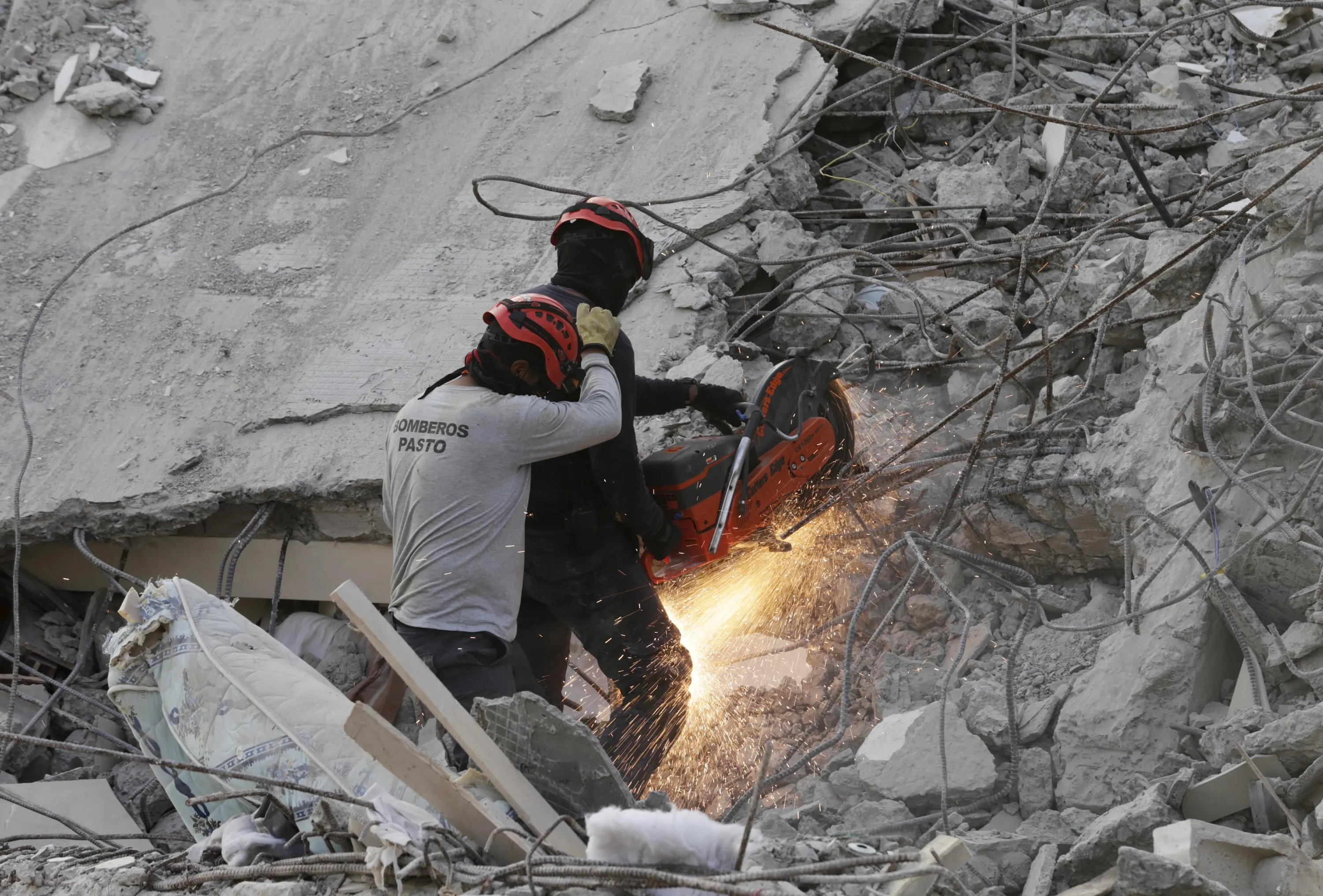 A rescue team member cuts an iron rod at a collapsed hotel after an earthquake struck off the Pacific coast, in Pedernales, Ecuador, April 19, 2016. (Photo by Henry Romero/Reuters)