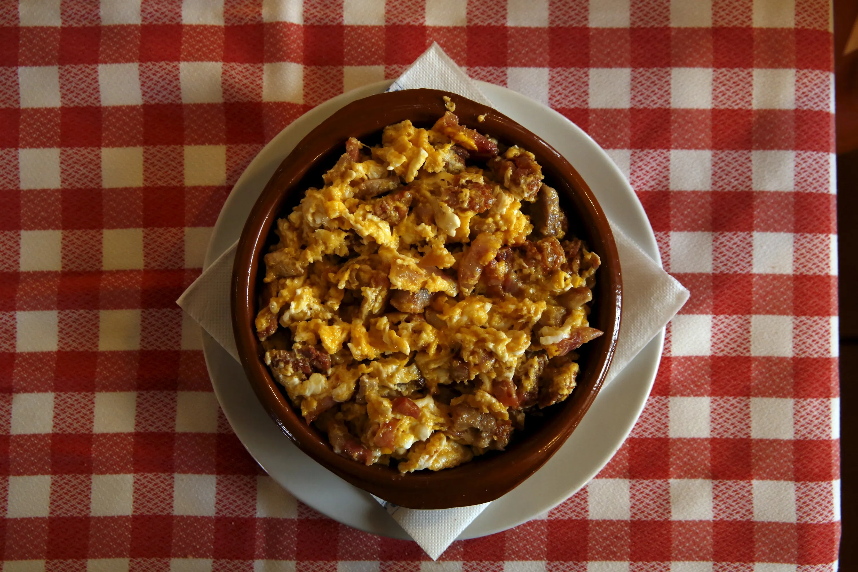 A dish of “Duelos y quebrantos” (griefs and breakings), which Cervantes wrote was Don Quixote's Saturday meal, is pictured at a restaurant in Puerto Lapice, Spain, April 8, 2016. The main ingredients are scrambled eggs, chorizo, ham, bacon and sometimes lamb brains. (Photo by Susana Vera/Reuters)