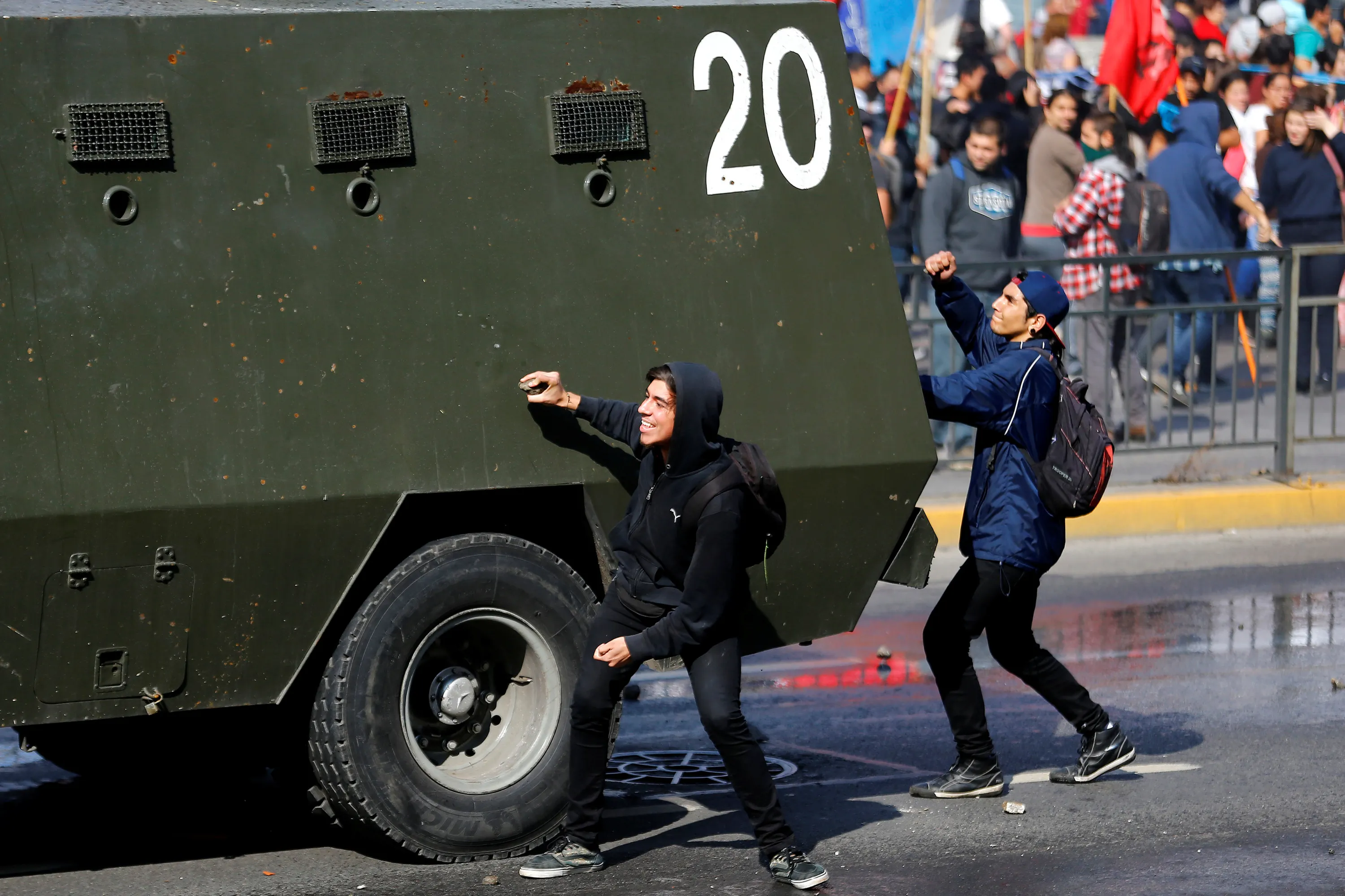 Student protesters hit a riot police vehicle during a demonstration to demand changes in the education system in Santiago, Chile, April 21, 2016. (Photo by Ivan Alvarado/Reuters)