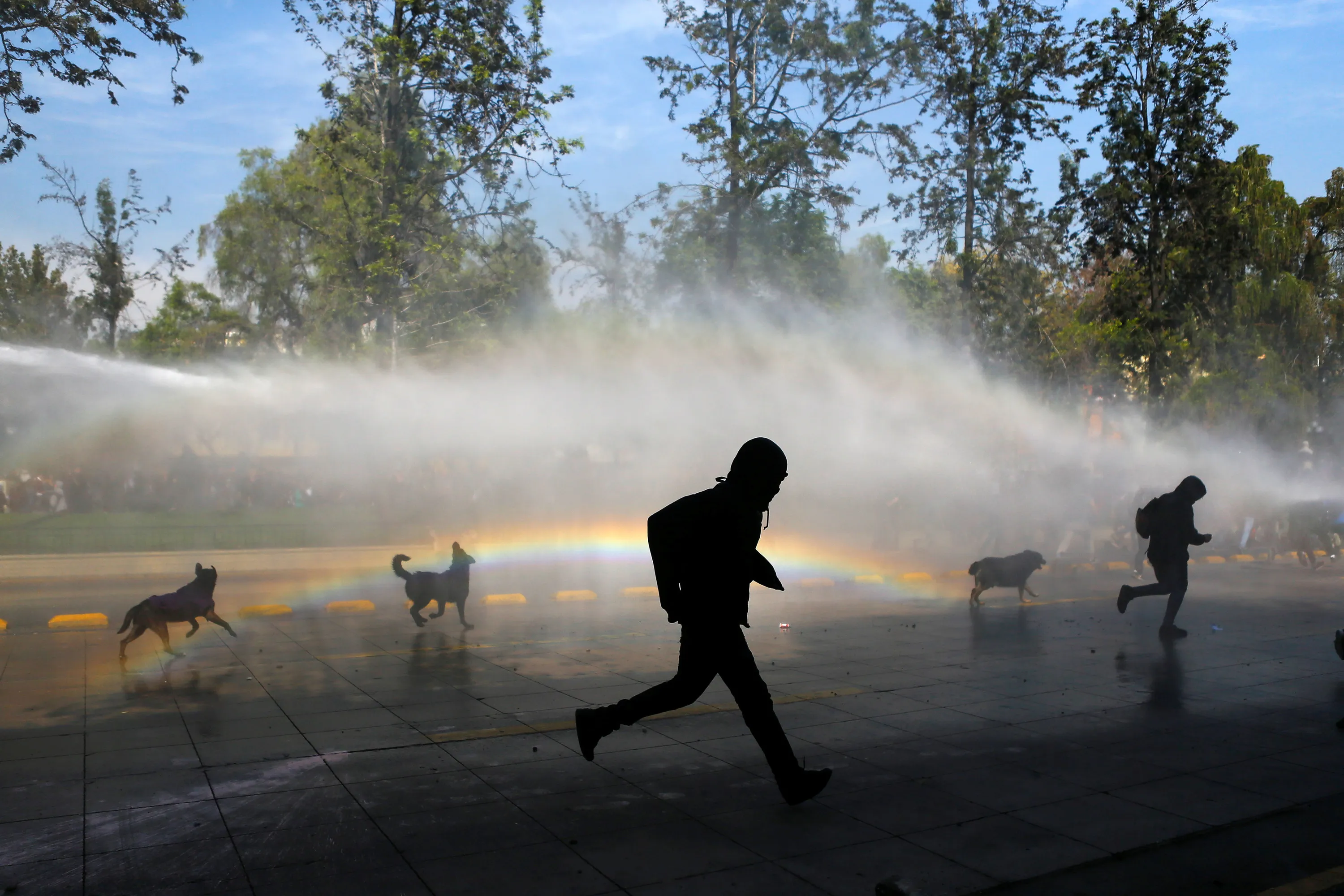 Student protesters run away as a riot police vehicle releases a jet of water during a demonstration to demand changes in the education system in Santiago, Chile, April 21, 2016. (Photo by Ivan Alvarado/Reuters)