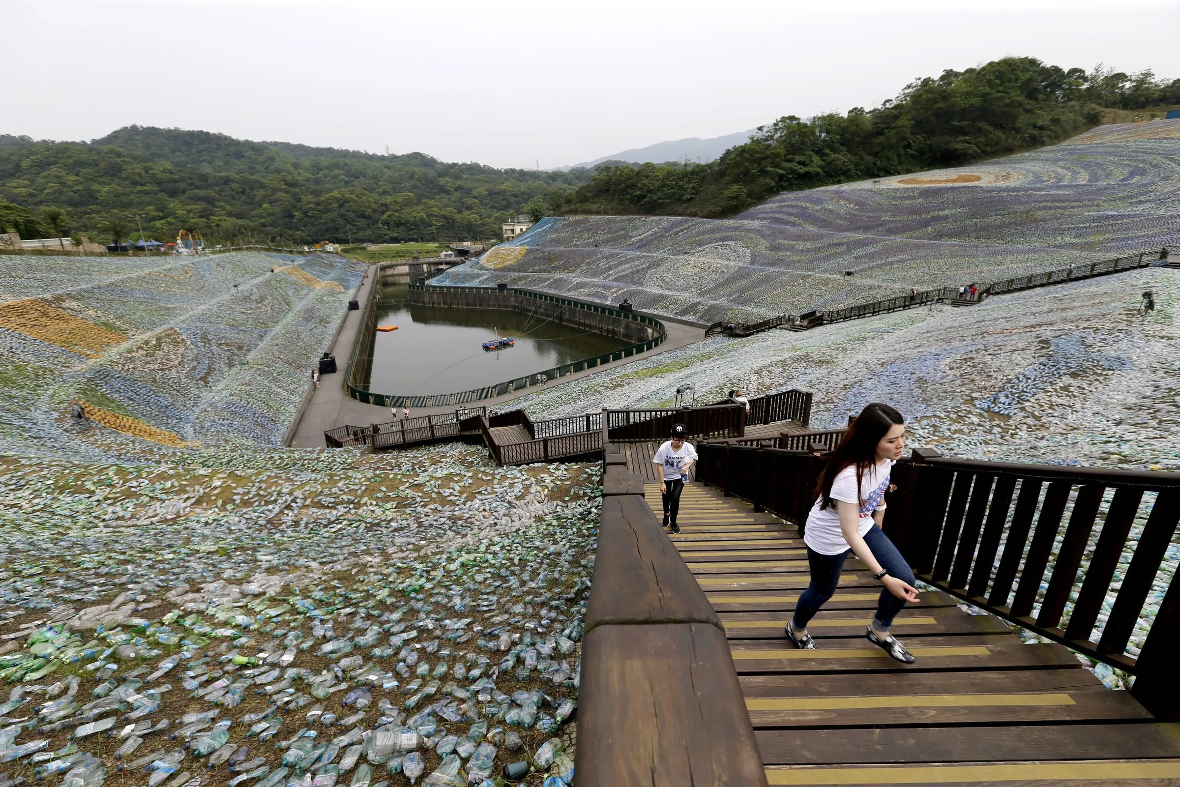 People walk around “The Starry Paradise”, a recreation of Van Gogh’s painting “The Starry Night” made from discarded plastic bottles at the Embrace Cultural and Creative Park in Keelung, Northern Taiwan, 21 April 2016. The recreated Van Gogh painting is made from four million discarded plastic bottles that covers 53 hectares of the park. The installation cost 90 million Taiwan dollars (2.5 Million Euro) that aims to promote environmental protection. (Photo by Ritchie B. Tongo/EPA)