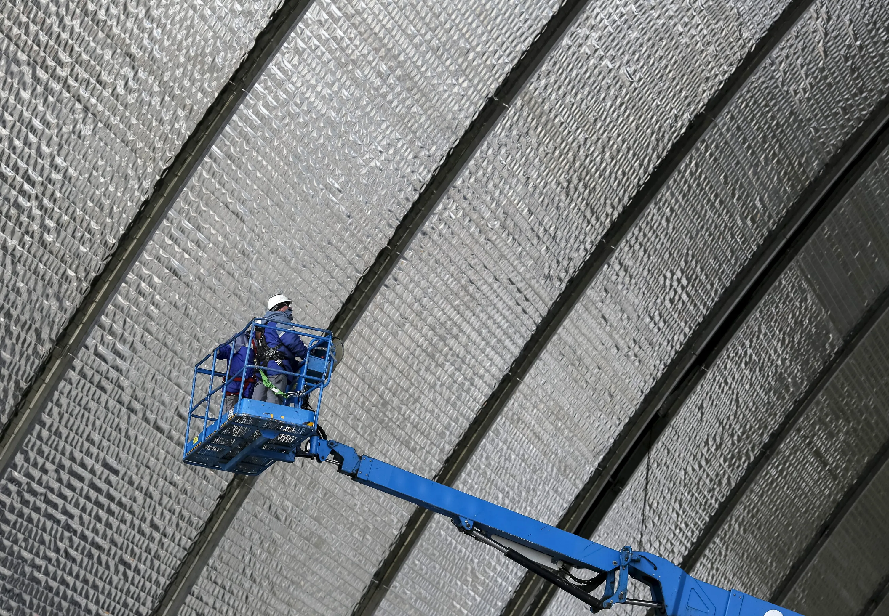 Employees work at construction of the New Safe Confinement (NSC) structure at the site of the Chernobyl nuclear reactor, Ukraine, April 22, 2016. (Photo by Gleb Garanich/Reuters)
